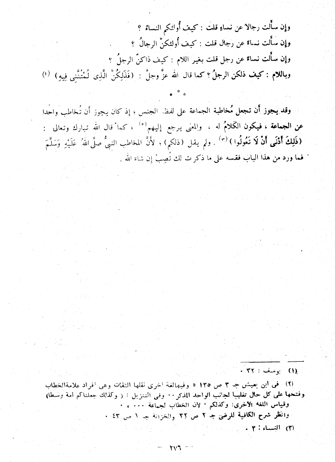 وَإِن سَأَلت رجلا عَن نسَاء قلت: كَيفَ أولئكم النِّسَاء؟ وَإِن سَأَلت نسَاء عَن رجال قلت: كَيفَ أولئكن الرِّجَال؟ وَإِن سَأَلت نسَاء عَن رجل قلت بِغَيْر اللَّام: كَيفَ ذاكن الرجل؟ وباللام: كَيفَ ذلكن الرجل؟ كَمَا قَالَ الله عز وَجل: {فذلكن الَّذِي لمتنني فِيهِ} وَقد يجوز أَن تجْعَل مُخَاطبَة الْجَمَاعَة عل لفظ الْجِنْس؛ إِذْ كَانَ يجوز أَن تخاطب وَاحِدًا عَن الْجَمَاعَة، فَيكون الْكَلَام لَهُ، وَالْمعْنَى يرجع إِلَيْهِم؛ كَمَا قَالَ الله تبَارك وَتَعَالَى: {ذَلِكَ أَدْنَى أَنْ تَعُولُوا} وَلم يقل (ذَلِكُم) ؛ لِأَن الْمُخَاطب النبى صلى الله عَلَيْهِ وَسلم فَمَا ورد من هَذَا الْبَاب فقسه على مَا ذكرت لَك تصب إِن شَاءَ الله