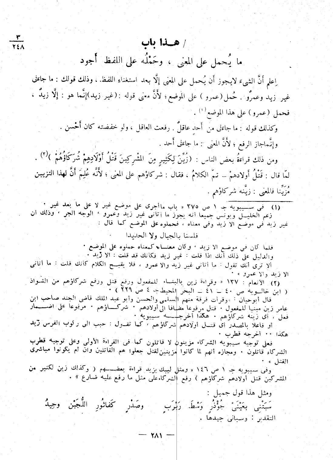 اعْلَم أَن الشئ لَا يجوز أَن يحمل على الْمَعْنى إِلَّا بعد اسْتغْنَاء اللَّفْظ، وَذَلِكَ قَوْلك: مَا جاءنى غير زيد وَعَمْرو حمل (عَمْرو) على الْموضع؛ لِأَن معنى قَوْله: (غير زيد) إِنَّمَا هُوَ: إِلَّا زيد، فَحمل (عَمْرو) على هَذَا الْموضع وَكَذَلِكَ قَوْله: مَا جاءنى من أحد عَاقل رفعت الْعَاقِل، وَلَو خفضته كَانَ أحسن وَإِنَّمَا جَازَ الرّفْع؛ لِأَن الْمَعْنى: مَا جاءنى أحد وَمن ذَلِك قِرَاءَة بعض النَّاس: {زين لكثير من الْمُشْركين قتل أَوْلَادهم شركاؤهم} لما قَالَ: قتل أَوْلَادهم - تمّ الْكَلَام، فَقَالَ: شركاؤهم على الْمَعْنى؛ لِأَنَّهُ علم أَن لهَذَا التزيين مزينا فَالْمَعْنى: زينه شركاؤهم