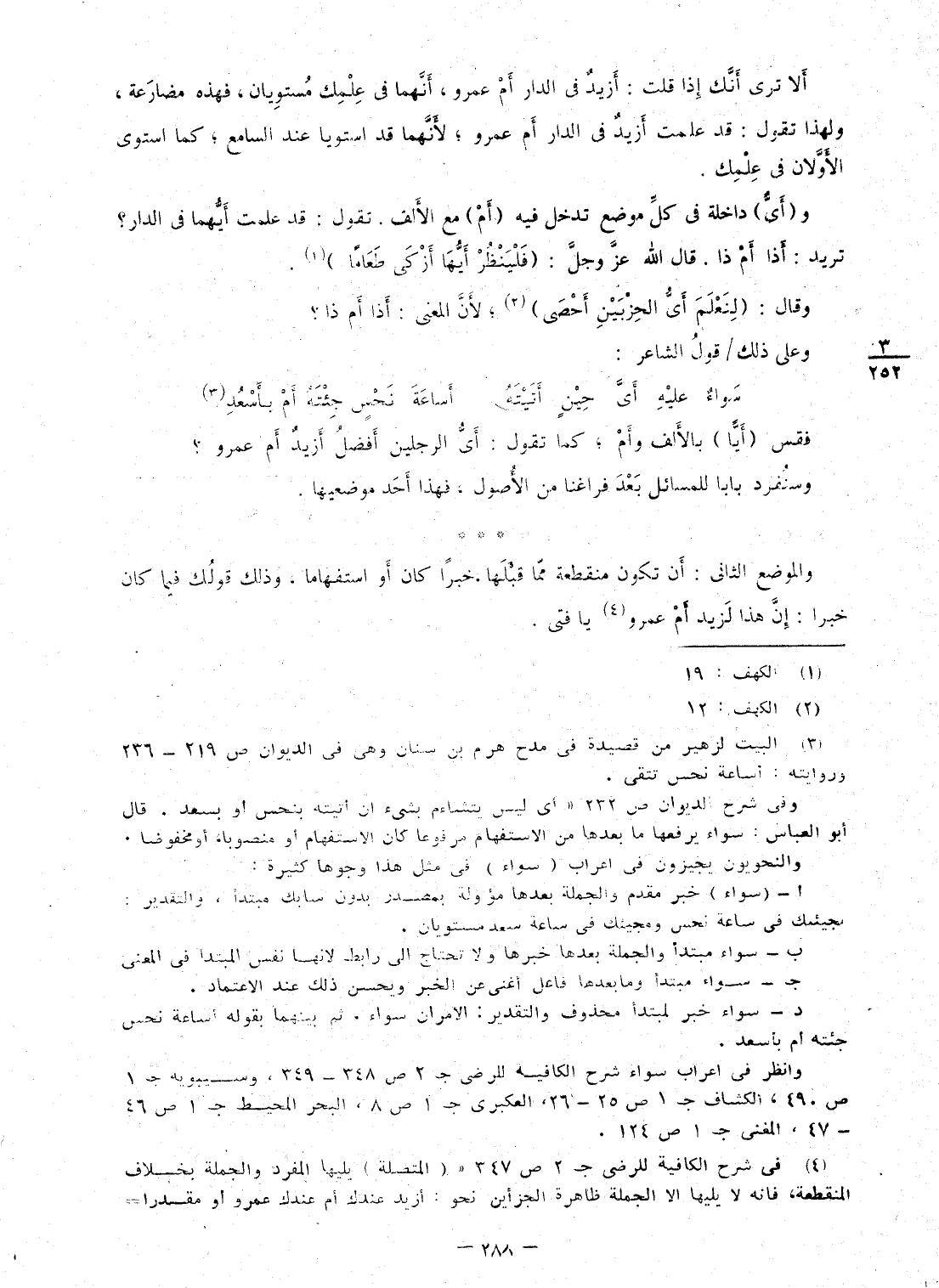 أَلا ترى أَنَّك إِذا قلت: أَزِيد فى الدَّار أم عَمْرو، أَنَّهُمَا فى علمك مستويان، فَهَذِهِ مضارعة، وَلِهَذَا تَقول: قد علمت أَزِيد فى الدَّار أم عَمْرو؛ لأنمها قد اسْتَويَا عِنْد السَّامع؛ كَمَا اسْتَوَى الْأَوَّلَانِ فى علمك و (أى) دَاخله فى كل مَوضِع تدخل فِيهِ (أم) مَعَ الْألف تَقول: قد علمت أَيهمَا فى الدَّار؟ تُرِيدُ: أذا أم ذَا قَالَ الله عز وَجل: {فَلْينْظر أَيهَا أزكى طَعَاما} وَقَالَ: {لنعلم أَي الحزبين أحصى} ؛ لِأَن الْمَعْنى: أذا أم ذَا؟ وعَلى ذَلِك / قَول الشَّاعِر: