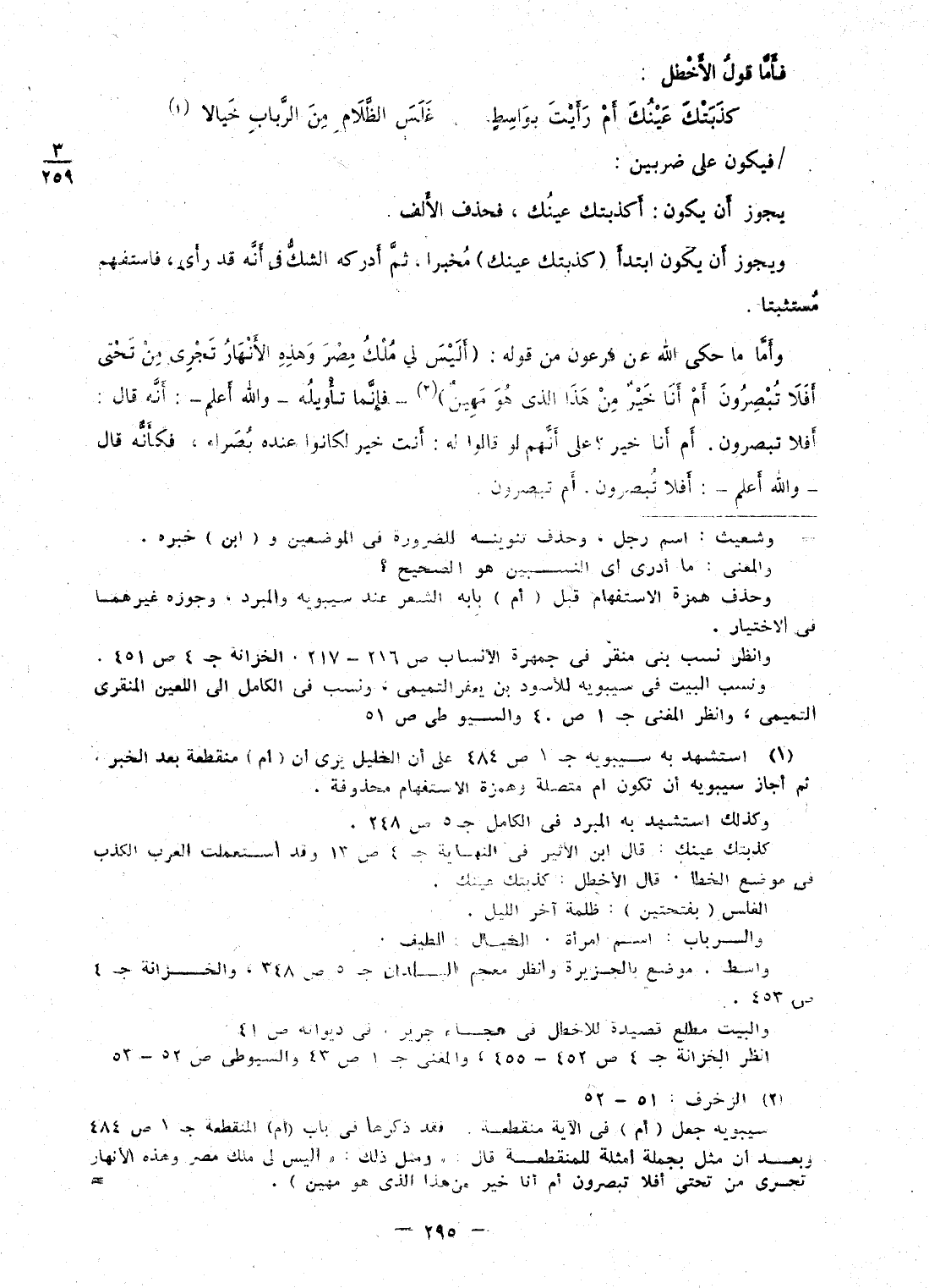 / فَيكون على ضَرْبَيْنِ: يجوز أَن يكون: أكذبتك عَيْنك، فَحذف الْألف وَيجوز أَن يكون ابْتَدَأَ (كذبتك عَيْنك) مخبرا، ثمَّ أدْركهُ الشَّك فى أَنه قد رأى، فاستقهم مستثبتا وَأما مَا حكى الله عَن فِرْعَوْن من قَوْله: ( {أَلَيْسَ لي ملك مصر وَهَذِه الْأَنْهَار تجْرِي من تحتي أَفلا تبصرون أم أَنا خير من هَذَا الَّذِي هُوَ مهين} - فَإِنَّمَا تَأْوِيله - وَالله أعلم -: أَنه قَالَ: أَفلا تبصرون أم أَنا خير؟ على أَنهم لَو قَالُوا لَهُ: أَنْت خير لكانوا عِنْده بصراء، فَكَأَنَّهُ قَالَ - وَالله أعلم -: أَفلا تبصرون أم تبصرون