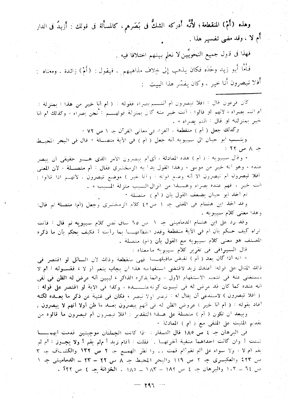 وَهَذِه (أم) المنقطعة؛ لِأَنَّهُ أدْركهُ الشَّك فى بصرهم، كالمسألة فى قَوْلك: أَزِيد فى الدَّار أم لَا، وَقد مضى تَفْسِير هَذَا فَهَذَا فى قَول جَمِيع النَّحْوِيين لَا تعلم بَينهم اخْتِلَافا فِيهِ فَأَما أَبُو زيد وَحده فَكَانَ يذهب إِلَى خلاف مذاهبهم، فَيَقُول: (أم) زَائِدَة، وَمَعْنَاهُ: أَفلا تبصرون أَنا خير، وَكَانَ يُفَسر هَذَا الْبَيْت: