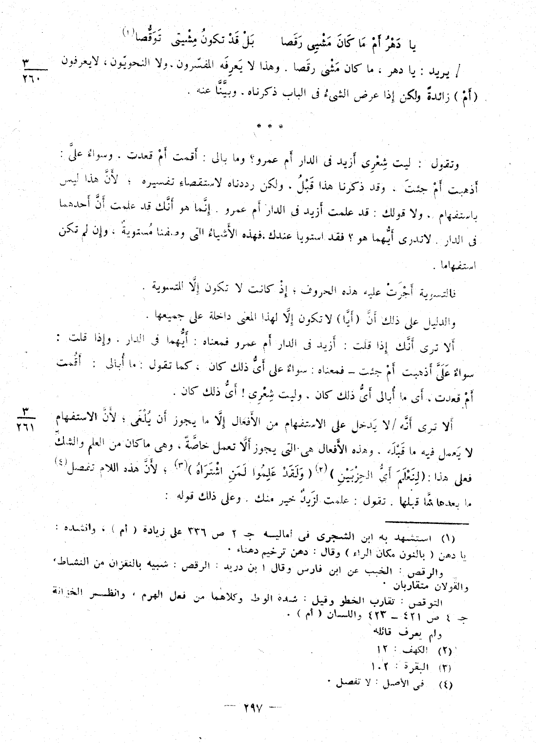/ يُرِيد: يَا دهر، مَا كَانَ مَشى رقصا وَهَذَا لَا يعرفهُ الْمُفَسِّرُونَ، وَلَا النحويون، لَا يعْرفُونَ (أم) زَائِدَة وَلَكِن إِذا عرض الشئ فى الْبَاب ذَكرْنَاهُ، وَبينا عَنهُ وَتقول: لَيْت شعرى أَزِيد فى الدَّار أم عَمْرو؟ وَمَا بالي: أَقمت أم قعدت، وَسَوَاء على: أذهبت أم جِئْت، وَقد ذكرنَا هَذَا قبل، وَلَكِن رددناه لاستقصاء تَفْسِيره؛ لِأَن هَذَا لَيْسَ باستفهام، وَلَا قَوْلك: قد علمت أَزِيد فى الدَّار أم عَمْرو إِنَّمَا هُوَ أَنَّك قد علمت أَن أَحدهمَا فى الدَّار لَا ندرى أَيهمَا هُوَ؟ فقد اسْتَويَا عنْدك، فَهَذِهِ الْأَشْيَاء الَّتِى وَصفنَا مستوية، وَإِن لم تكن استفهاما فالتسوية أجرت عَلَيْهِ هَذِه الْحُرُوف؛ إِذْ كَانَت لَا تكون إِلَّا للتسوية وَالدَّلِيل على ذَلِك أَن (أيا) لَا تكون إِلَّا لهَذَا الْمَعْنى دَاخِلَة على جَمِيعهَا أَلا ترى أَنَّك إِذا قلت: أَزِيد فى الدَّار أم عَمْرو فَمَعْنَاه: أَيهمَا فى الدَّار وَإِذا قلت: سَوَاء على أذهبت أم جِئْت - فَمَعْنَاه: سَوَاء على أى ذَلِك كَانَ، كَمَا تَقول: مَا أبالى: أَقمت أم قعدت، أى مَا أبالى أى ذَلِك كَانَ، وليت شعرى! أى ذَلِك كَانَ أَلا ترى أَنه / لَا يدْخل على الِاسْتِفْهَام من الْأَفْعَال إِلَّا مَا يجوز أَن يلغى؛ لِأَن الِاسْتِفْهَام لَا يعْمل فِيهِ مَا قبله، وَهَذِه الْأَفْعَال هى الَّتِى يجوز أَلا تعْمل خَاصَّة، وهى مَا كَانَ من الْعم وَالشَّكّ فعلى هَذَا: (لنعلم أى الحزبين) (وَلَقَد علمُوا لمن اشْتَرَاهُ) ؛ لِأَن هَذِه اللَّام نفصل مَا بعْدهَا وَمَا قبلهَا تَقول: علمت لزيد خير مِنْك وعَلى ذَلِك قَوْله: