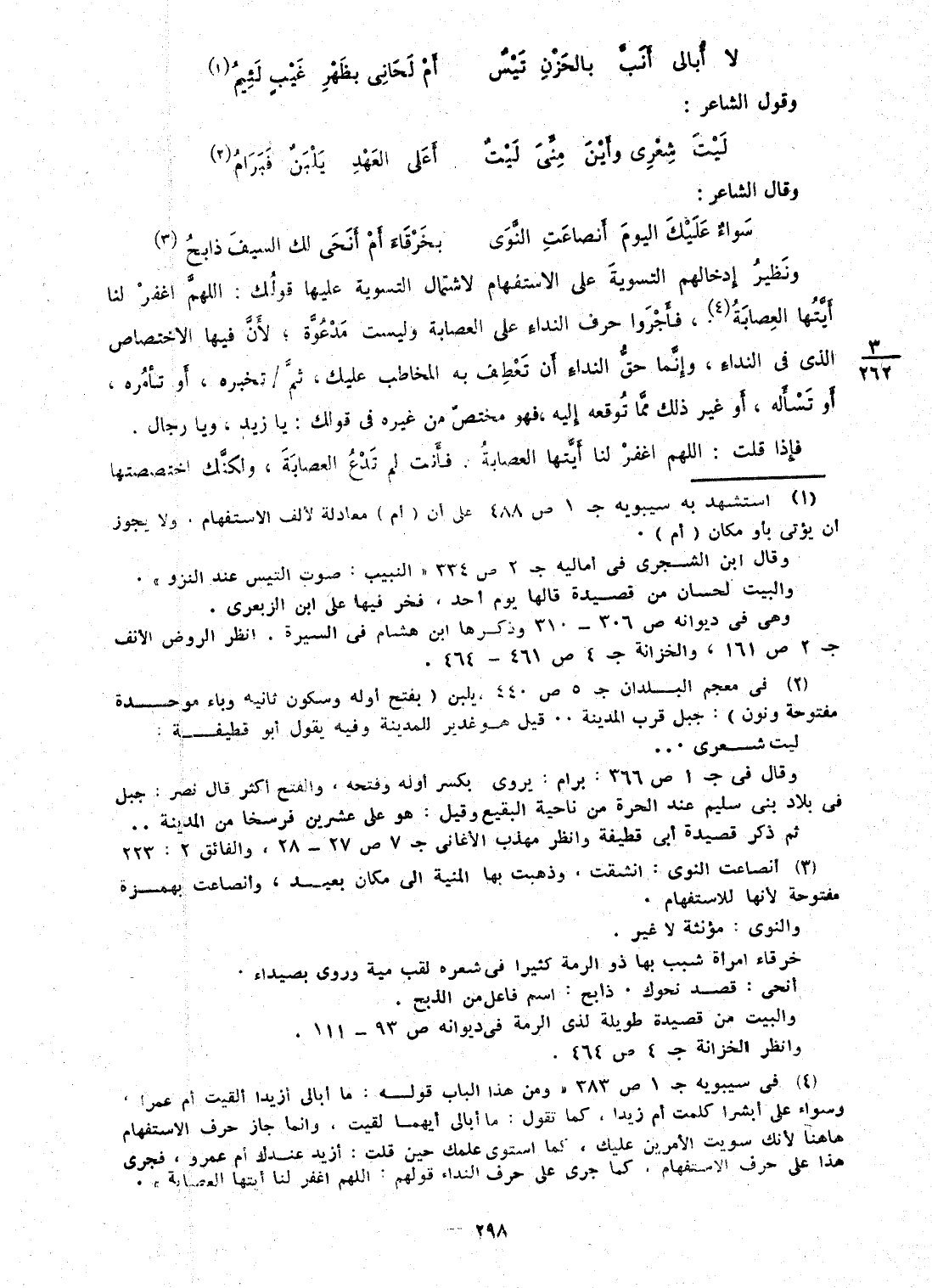 وَنَظِير إدخالهم التَّسْوِيَة على الِاسْتِفْهَام لاشتمال التَّسْوِيَة عَلَيْهَا قَوْلك: اللَّهُمَّ اغْفِر لنا أيتها الْعِصَابَة، فأجروا حرف النداء على الْعِصَابَة وَلَيْسَت مدعوة؛ لِأَن فِيهَا الِاخْتِصَاص الذى فى النداء، وَإِنَّمَا حق النداء أنم تعطف بِهِ الْمُخَاطب عَلَيْك، ثمَّ / تخبره، أَو تَأمره، أَو تسأله، أَو غير ذَلِك مِمَّا توقعه إِلَيْهِ، فَهُوَ مُخْتَصّ من غَيره فى قَوْلك: يَا زيد، وَيَا رجال فَإِذا قلت: اللَّهُمَّ اغْفِر لنا أيتها الْعِصَابَة فَأَنت لم تدع الْعِصَابَة، وَلَكِنَّك اختصصتها