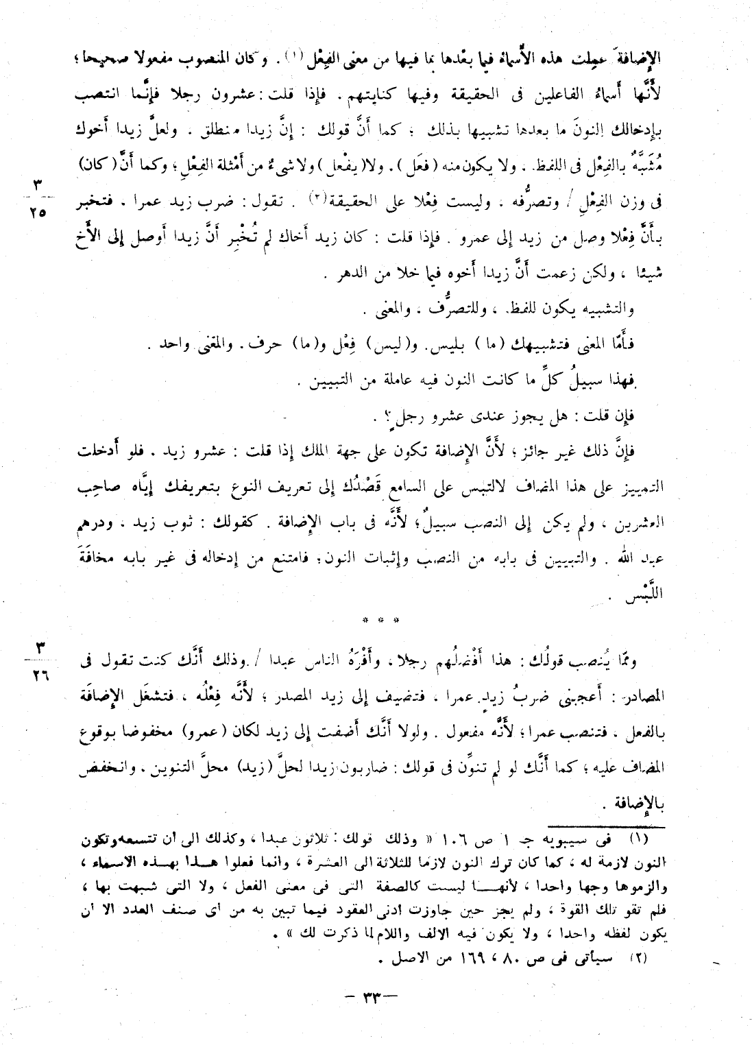 الْإِضَافَة عملت هَذِه الْأَسْمَاء فِيمَا بعْدهَا بِمَا فِيهَا من معنى الْفِعْل وَكَانَ الْمَنْصُوب مَفْعُولا صَحِيحا؛ لِأَنَّهَا أَسمَاء الفاعلين فى الْحَقِيقَة وفيهَا كنايتهم فَإِذا قلت: عشرُون رجلا فَإِنَّمَا انتصب بإدخالك النُّون مَا بعْدهَا تَشْبِيها بذلك؛ كَمَا أَن قَوْلك: إِن زيدا منطلق وَلَعَلَّ زيدا أَخُوك مشبه بِالْفِعْلِ فى اللَّفْظ، وَلَا يكون مِنْهُ (فعل) ، وَلَا (يفعل) وَلَا شئ من أَمْثِلَة الْفِعْل؛ وكما أَن (كَانَ) فى وزن الْفِعْل / وتصرفه، وَلَيْسَت فعلا على الْحَقِيقَة تَقول: ضرب زيدا عمرا، فتخبر بِأَن فعلا وصل من زيد إِلَى عَمْرو فَإِذا قلت: كَانَ زيد أَخَاك لم تخبر أَن زيدا أوصل إِلَى الْأَخ شَيْئا، وَلَكِن زعمت أَن زيدا أخوة فِيمَا خلا من الدَّهْر والتشبيه يكون للفظ، وللتصرف، وَالْمعْنَى فَأَما الْمَعْنى فتشبيهك (مَا) بليس و (لَيْسَ) فعل و (مَا) حرف، وَالْمعْنَى وَاحِد فَهَذَا سَبِيل كل مَا كَانَت النُّون فِيهِ عاملة من التَّبْيِين فَإِن قلت: هَل يجوز عندى عشرو رجل؟ فَإِن ذَلِك غير جَائِز؛ لِأَن الْإِضَافَة تكون على جِهَة الْملك إِذا قلت: عشرو زيد، فَلَو أدخلت التَّمْيِيز على هَذَا الْمُضَاف لالتبس على السَّامع قصدك إِلَى تَعْرِيف النَّوْع بتعرفك إِيَّاه صَاحب الْعشْرين، وَلم يكن إِلَى النصب سَبِيل؛ لِأَنَّهُ فى بَاب الْإِضَافَة كَقَوْلِك: ثوب زيد، وَدِرْهَم عبد الله والتبيين فى بَابه من النصب وَإِثْبَات النُّون؛ فَامْتنعَ من إِدْخَاله فى غير بَابه مَخَافَة اللّبْس وَمِمَّا ينصب قَوْلك: هَذَا أفضلهم رجلا، وأفره النَّاس عبدا / وَذَلِكَ أَنَّك كنت تَقول فى المصادر: أعجبنى ضرب زيد عمرا، فتضيف إِلَى زيد الْمصدر؛ لِأَنَّهُ فعله، فتشغل الْإِضَافَة بِالْفِعْلِ، فتنصب عمرا؛ لِأَنَّهُ مفعول وَلَوْلَا أَنَّك أضفت إِلَى زيد لَكَانَ (عَمْرو) مخفوضا بِوُقُوع الْمُضَاف عَلَيْهِ؛ كَمَا أَنَّك لَو لم تنون فى قَوْلك: ضاربون زيدا لحل (زيد) مَحل التَّنْوِين، وانخفض بِالْإِضَافَة