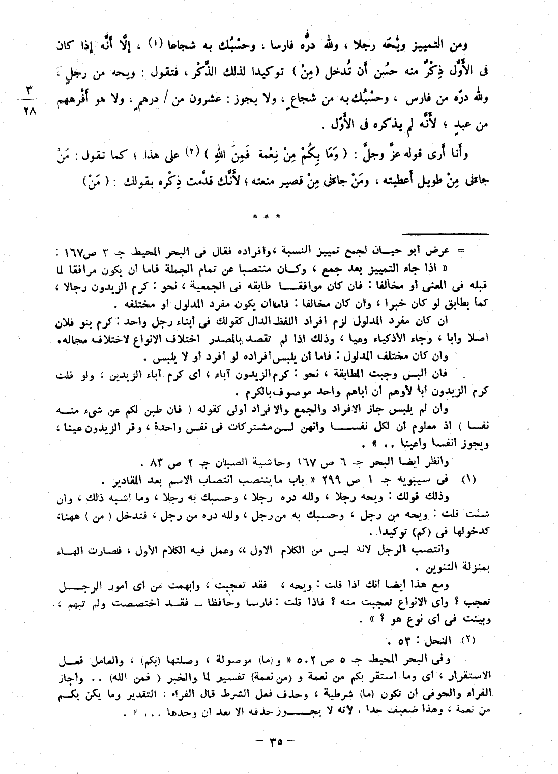 وَمن التَّمْيِيز ويحه رجلا، وَالله دره فَارِسًا، وحسبك بِهِ شجاعا، إِلَّا أَنه إِذا كَانَ فى الأول ذكر مِنْهُ حسن أَن تدخل (من) توكيدا لذَلِك الذّكر، فَتَقول: ويحه من رجل، وَللَّه دره من فَارس، وحسبك بِهِ من شُجَاع، وَلَا يجوز: عشرُون من / دِرْهَم، وَلَا هُوَ أفرههم من عبد؛ لِأَنَّهُ لم يذكرهُ فى الأول وَأَنا أرى قَوْله عز وَجل: {وَمَا بكم من نعْمَة فَمن الله} على هَذَا؛ كَمَا تَقول: من جاءنى من طَوِيل أَعْطيته، وَمن جاءنى من قصير منعته؛ لِأَنَّك قدمت ذكره بِقَوْلِك: (من)