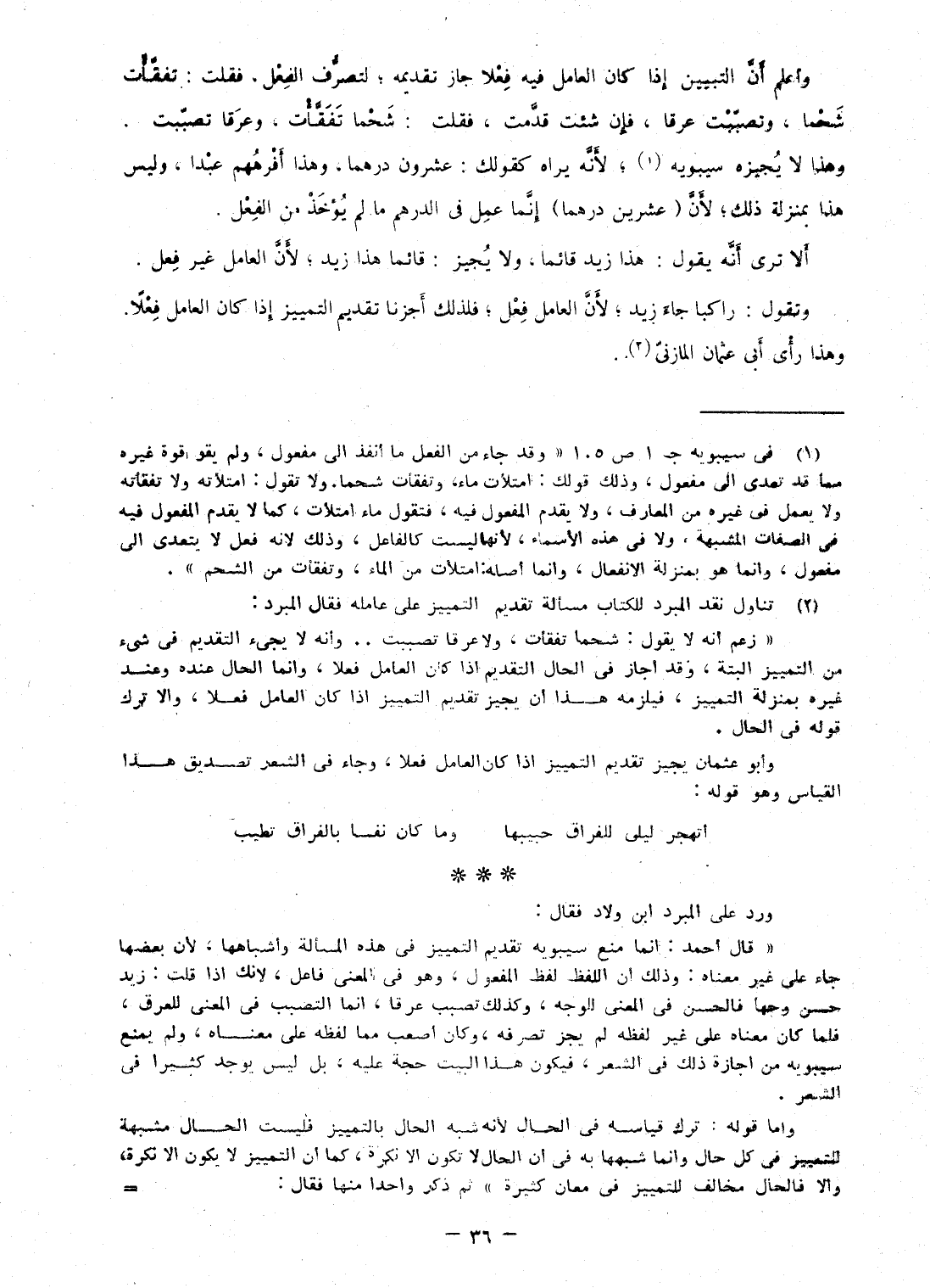 وَاعْلَم أَن التَّبْيِين إِذا كَانَ الْعَامِل فِيهِ فعلا جَازَ تَقْدِيمه؛ لتصرف الْفِعْل، فَقلت: تفقأت شحما، وتصببت عرقا، فَإِن شِئْت قدمت، فَقلت: شحما تفقأت، وعرقا تصببت وَهَذَا لَا يُجِيزهُ سِيبَوَيْهٍ؛ لِأَنَّهُ يرَاهُ كَقَوْلِك: عشرُون درهما، وَهَذَا أفرههم عبدا، وَلَيْسَ هَذَا بِمَنْزِلَة ذَلِك؛ لِأَن (عشْرين درهما) إِنَّمَا عمل فِي الدِّرْهَم مَا لم يُؤْخَذ من الْفِعْل أَلا ترى أَنه يَقُول: هَذَا زيد قَائِما، وَلَا يُجِيز: قَائِما هَذَا زيد؛ لِأَن الْعَامِل غير فعل وَتقول: رَاكِبًا جَاءَ زيد؛ لِأَن الْعَامِل فعل؛ فَلذَلِك أجزنا تَقْدِيم التَّمْيِيز إِذا كَانَ الْعَامِل فعلا وَهَذَا رأى أبي عُثْمَان المازنى