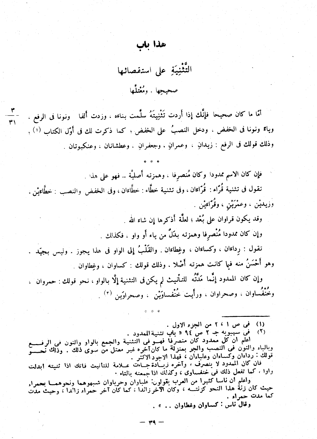 أما مَا كَانَ صَحِيحا فَإنَّك إِذا أردْت تثنيته سلمت بناءه، وزدت ألفا ونونا فى الرّفْع، وياء ونونا فى الْخَفْض، وَدخل النصب على الْخَفْض؛ كَمَا ذكرت لَك فى أول الْكتاب؛ وَذَلِكَ قَوْلك فى الرّفْع: زَيْدَانَ، وَعمْرَان وجعفران، وعطشانان، وعنكبوتان فَإِن كَانَ الِاسْم ممدودا وَكَانَ منصرفا، وهمزته أَصْلِيَّة - فَهُوَ على هَذَا تَقول فى تَثْنِيَة قراء: قراءان، وفى تَثْنِيَة خطاء: خطاءان، وفى الْخَفْض وَالنّصب: خطاءين، وزيدين، وعمرين، وقراءين وَقد يكون قراوان على بعد، لعِلَّة أذكرها إِن شَاءَ الله وَإِن كَانَ ممدودا منصرفا وهمزته بدل من يَاء أَو وَاو، فَكَذَلِك تَقول: رداءان، وكساءان، وغطاءان وَالْقلب إِلَى الْوَاو فى هَذَا يجوز، وَلَيْسَ بجيد، وَهُوَ أحسن مِنْهُ فِيمَا كَانَت همزته أصلا، وَذَلِكَ قَوْلك: كساوان وغطاوان وَإِن كَانَ الْمَمْدُود إِنَّمَا مدَّته للتأنيث لم يكن فى التَّثْنِيَة إِلَّا بِالْوَاو، نَحْو قَوْلك: حمروان، وخنفساوان، وصحراوان، وَرَأَيْت خنفساوين، وصحراوين