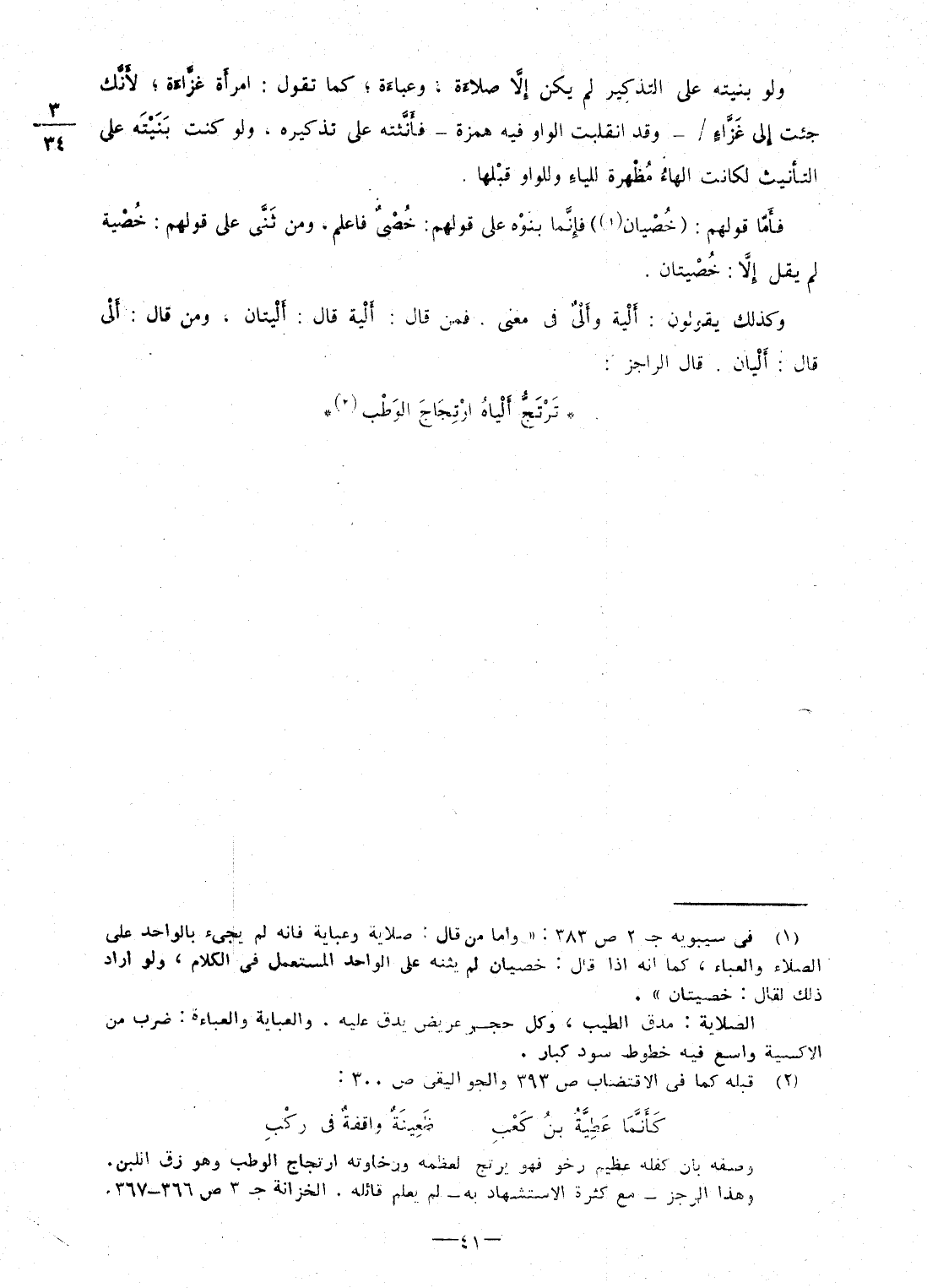 وَلَو بنيته على التَّذْكِير لم يكن إِلَّا صلاءة، وعباءة؛ كَمَا تَقول: امْرَأَة غزاءة؛ لِأَنَّك جِئْت إِلَى غزاء / - وَقد انقلبت الْوَاو فِيهِ همزَة - فأنثته على تذكيره، وَلَو كنت بنيته على التَّأْنِيث لكَانَتْ الْهَاء مظهرة للياء وللواو قبلهَا فَأَما قَوْلهم: (خصيان فَإِنَّمَا بنوه على قَوْلهم: خصى فَاعْلَم، وَمن ثنى على قَوْلهم: خصية لم يقل إِلَّا: خصيتان وَكَذَلِكَ يَقُولُونَ: ألية وألى فى معنى فَمن قَالَ: ألية قَالَ: أليتان، وَمن قَالَ: ألى قَالَ: أليان قَالَ الراجز: