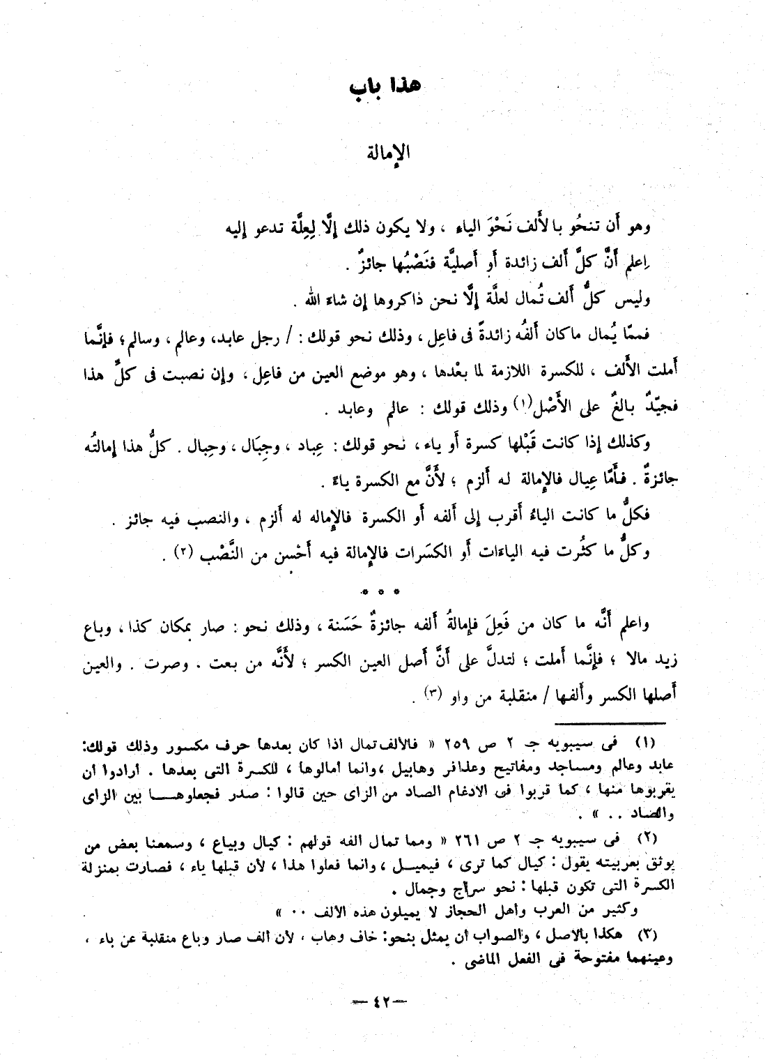 وَهُوَ أَن تنجو بِالْألف نَحْو الْيَاء، وَلَا يكون ذَلِك إِلَّا لعِلَّة تَدْعُو إِلَيْهِ اعْلَم أَن كل ألف زَائِدَة أَو أَصْلِيَّة فنصبها جَائِز وَلَيْسَ كل ألف تمال لعِلَّة إِلَّا نَحن ذاكروها إِن شَاءَ الله فمما يمال مَا كَانَ أَلفه زَائِدَة فى فَاعل، وَذَلِكَ نَحْو قَوْلك: / رجل عَابِد، وعالم، وَسَالم؛ فَإِنَّمَا أملت الْألف، للكسرة اللَّازِمَة لما بعْدهَا، وَهُوَ مَوضِع الْعين من فَاعل، وَإِن نصبت فى كل هَذَا فجيد بَالغ على الأَصْل وَذَلِكَ قَوْلك: عَالم وعابد وَكَذَلِكَ إِذا كَانَت قبلهَا كسرة أَو يَاء، نَحْو قَوْلك: عباد، وجبال، وحبال كل هَذَا إمالته جَائِزَة فَأَما عِيَال فالإمالة لَهُ ألزم؛ لِأَن مَعَ الكسرة يَاء فَكل مَا كَانَت الْيَاء أقرب إِلَى أَلفه أَو الكسرة فالإماله لَهُ ألزم، وَالنّصب فِيهِ جَائِز وكل مَا كثرت فِيهِ الياءات أَو الكسرات فالإمالة فِيهِ أحسن من النصب وَاعْلَم أَنه مَا كَانَ من فعل فإمالة أَلفه جَائِزَة حَسَنَة، وَذَلِكَ نَحْو: صَار بمَكَان كَذَا، وَبَاعَ زيد مَالا؛ فَإِنَّمَا أملت؛ لتدل على أَن أصل الْعين الْكسر؛ لِأَنَّهُ من بِعْت، وصرت وَالْعين أَصْلهَا الْكسر وألفها / منقلبة من وَاو