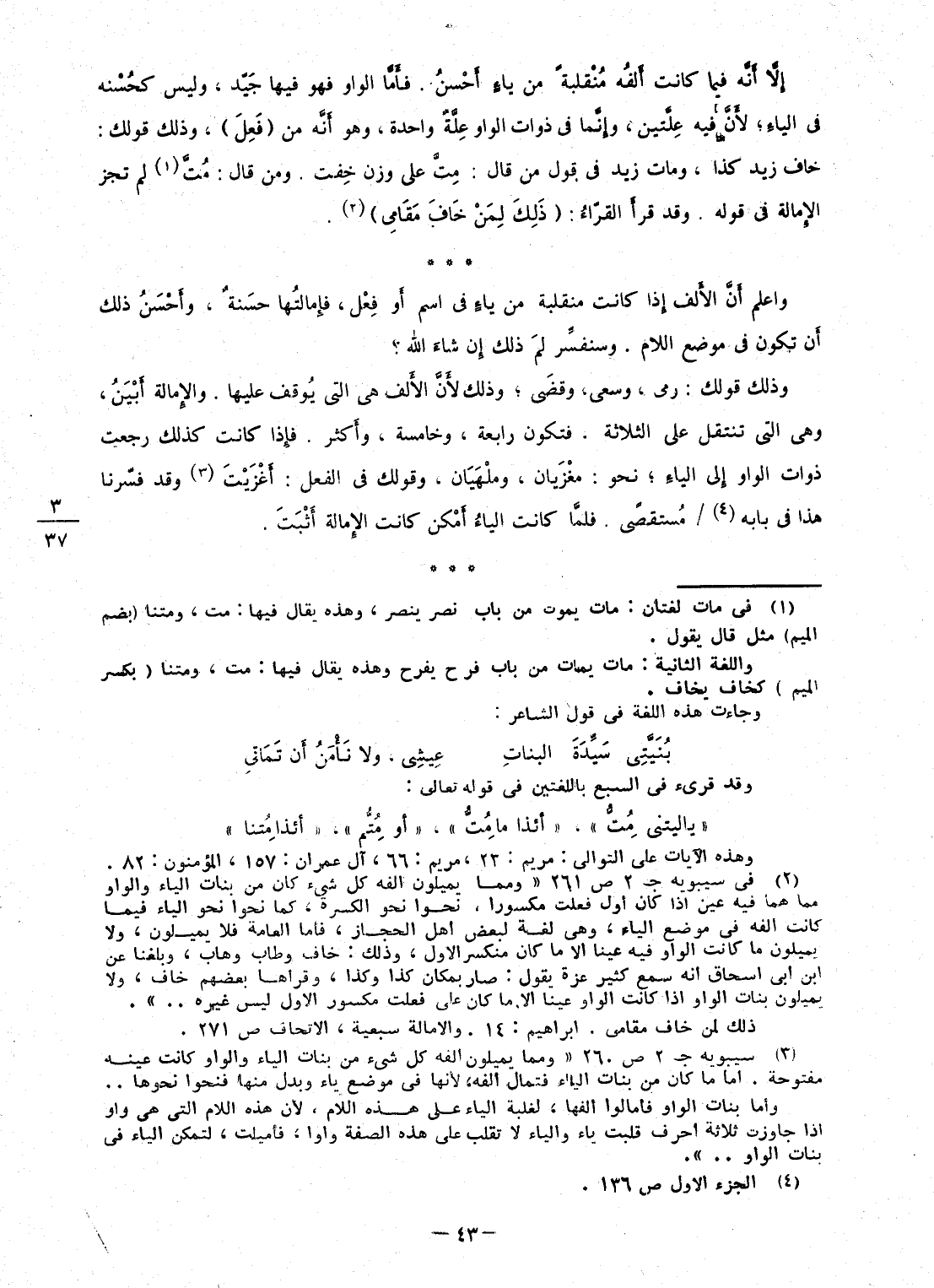 إِلَّا أَنه فِيمَا كَانَت أَلفه منقلبة من يَاء أحسن فَأَما الْوَاو فَهُوَ فِيهَا جيد، وَلَيْسَ كحسنه فى الْيَاء؛ لِأَن فِيهِ علتين، وَإِنَّمَا فى ذَوَات الْوَاو عِلّة وَاحِدَة، وَهُوَ أَنه من (فعل) ، وَذَلِكَ قَوْلك: خَافَ زيد كَذَا، وَمَات زيد فى قَول من قَالَ: مت على وزن خفت وَمن قَالَ: مت لم تجز الإمالة فى قَوْله وَقد قَرَأَ الْقُرَّاء: {ذَلِك لمن خَافَ مقَامي} وَاعْلَم أَن الْألف إِذا كَانَت منقلبة من يَاء فى اسْم أَو فعل، فإمالتها حَسَنَة، وَأحسن ذَلِك أَن تكون فى مَوضِع اللَّام وسنفسر لم ذَلِك إِن شَاءَ الله؟ وَذَلِكَ قَوْلك: رمى، وسعى، وَقضى؛ وَذَلِكَ لِأَن الْألف هى الَّتِى يُوقف عَلَيْهَا والإمالة أبين، وهى الَّتِى تنْتَقل على الثَّلَاثَة فَتكون رَابِعَة، وخامسة، وَأكْثر فَإِذا كَانَت كَذَلِك رجعت ذَوَات الْوَاو إِلَى الْيَاء؛ نَحْو: مغزيان، وملهيان، وقولك فى الْفِعْل: أغزيت وَقد فسرنا هَذَا فى بَابه / مستقصى فَلَمَّا كَانَت الْيَاء أمكن كَانَت الإمالة أثبت