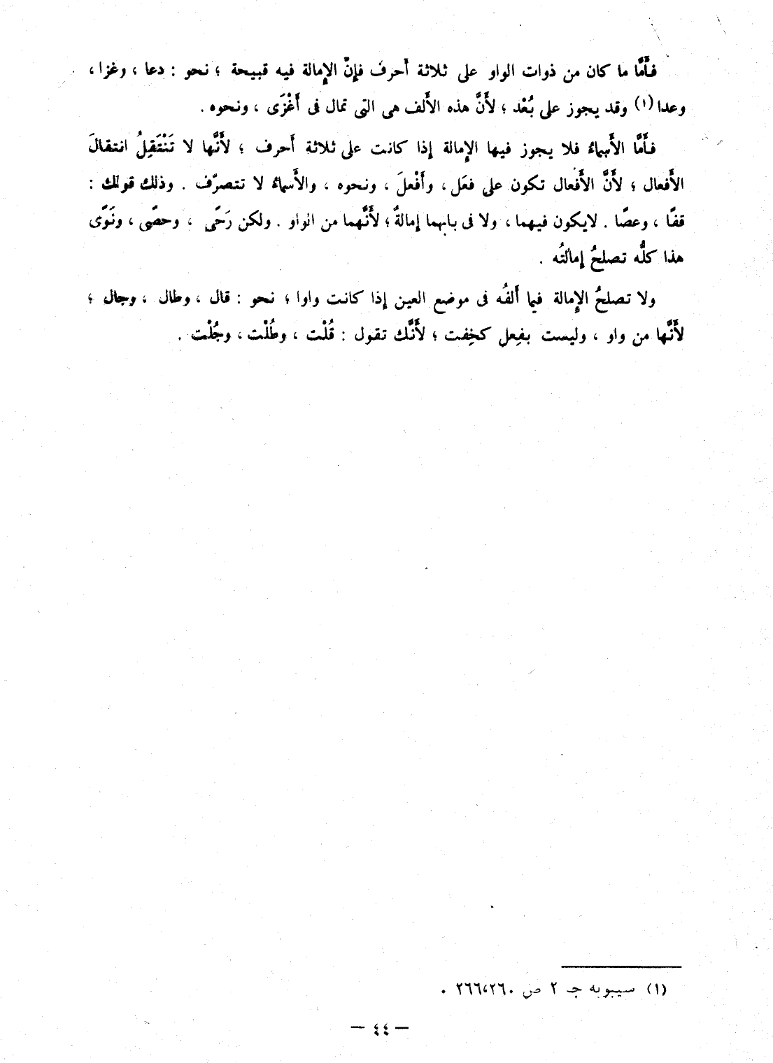 فَأَما مَا كَانَ من ذَوَات الْوَاو على ثَلَاثَة أحرف فَإِن الإمالة فِيهِ قبيحة؛ نَحْو: دَعَا، وغزا، وَعدا وَقد يجوز على بعد؛ لِأَن هَذِه الْألف هى الَّتِى تمال فى أغزى، وَنَحْوه فَأَما الْأَسْمَاء فَلَا يجوز فِيهَا الإمالة إِذا كَانَت على ثَلَاثَة أحرف؛ لِأَنَّهَا لَا تنْتَقل انْتِقَال الْأَفْعَال؛ لِأَن الْأَفْعَال تكون على فعل، وأفعل، وَنَحْوه، والأسماء لَا تتصرف وَذَلِكَ قَوْلك: قفا، وعصا لَا يكون فيهمَا، وَلَا فى بابهما إمالة؛ لِأَنَّهُمَا من الْوَاو وَلَكِن رحى، وحصى، وَنوى هَذَا كُله تصلح إمالته وَلَا تصلح الإمالة فِيمَا أَلفه فى مَوضِع الْعين إِذا كَانَت واوا؛ نَحْو: قَالَ، وَطَالَ، وجال؛ لِأَنَّهَا من وَاو، وَلَيْسَت بِفعل كخفت؛ لِأَنَّك تَقول: قلت، وطلت، وجلت