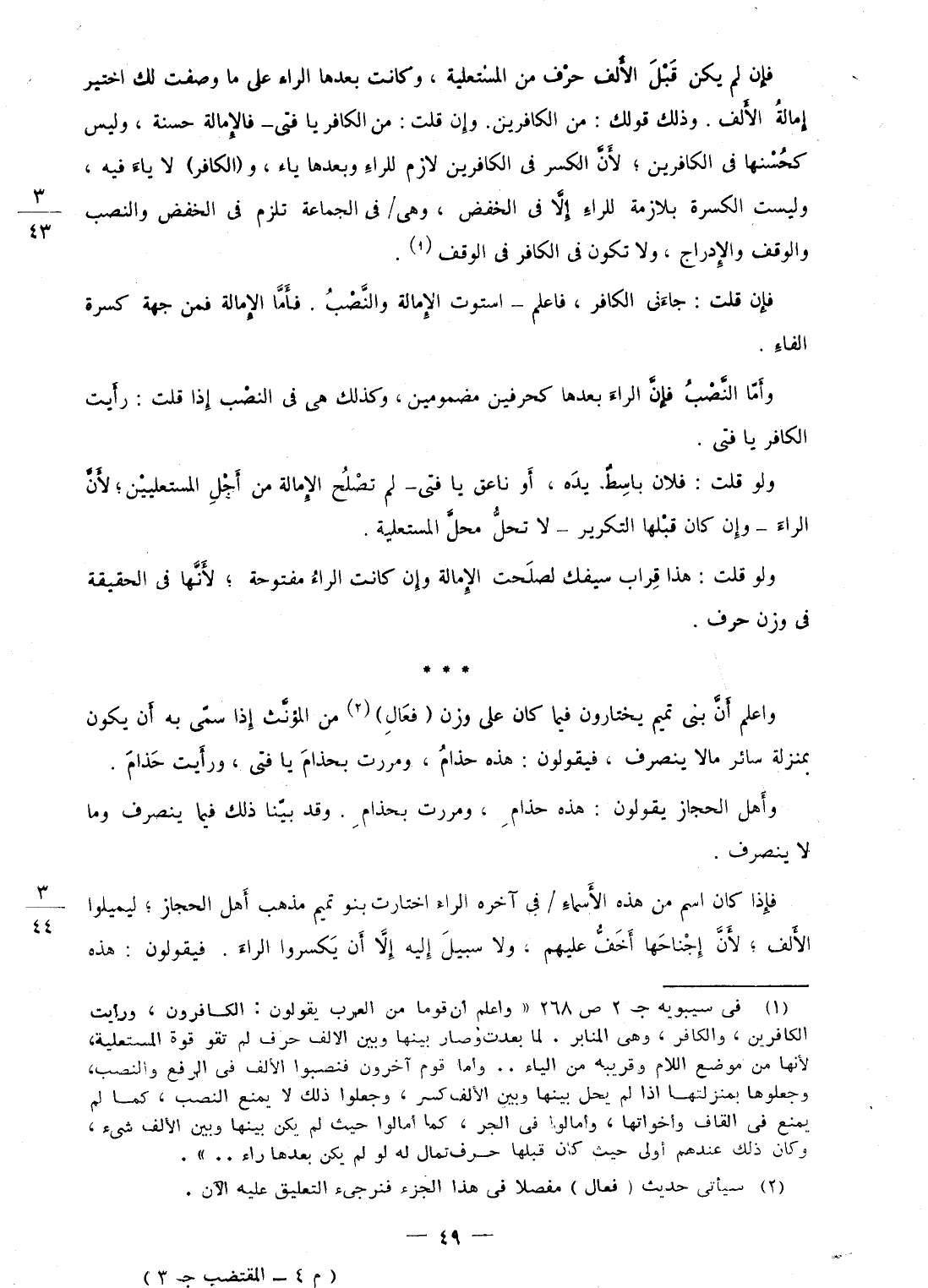 فَإِن لم يكن قبل الْألف حرف من المستعلية، وَكَانَت بعْدهَا الرَّاء على مَا وصفت لَك اختير إمالة الْألف وَذَلِكَ قَوْلك: من الْكَافرين وَإِن قلت: من الْكَافِر يَا فَتى - فالإمالة حَسَنَة، وَلَيْسَ كحسنها فى الْكَافرين؛ لِأَن الْكسر فى الْكَافرين لَازم للراء وَبعدهَا يَاء، و (الْكَافِر) لَا يَاء فِيهِ، وَلَيْسَت الكسرة بلازمة للراء إِلَّا فى الْخَفْض، هى / فى الْجَمَاعَة تلْزم فى الْخَفْض وَالنّصب وَالْوَقْف والإدراج، وَلَا تكون فى الْكَافِر فى الْوَقْف فَإِن قلت: جاءنى الْكَافِر، فَاعْلَم - اسْتَوَت الإمالة وَالنّصب فَأَما الإمالة فَمن جِهَة كسرة الْفَاء وَأما النصب فَإِن الرَّاء بعْدهَا كحرفين مضمومين، وَكَذَلِكَ هى فى النصب إِذا قلت: رَأَيْت الْكَافِر يَا فَتى وَلَو قلت: فلَان باسط يَده، أَو ناعق يَا فَتى - لم تصلح الإمالة من أجل المستعليين؛ لِأَن الرَّاء - وَإِن كَانَ قبلهَا التكرير - لَا تحل مَحل المستعلية وَلَو قلت: هَذَا قرَاب سَيْفك لصلحت الإمالة وَإِن كَانَت الرَّاء مَفْتُوحَة؛ لِأَنَّهَا فى الْحَقِيقَة فى وزن حرف وَاعْلَم أَن بنى تَمِيم يختارون فِيمَا كَانَ على وزن (فعال) من الْمُؤَنَّث إِذا سمى بِهِ أَن يكون بِمَنْزِلَة سَائِر مَالا ينْصَرف، فَيَقُولُونَ: هَذِه حذام، ومررت بحذام يَا فَتى، وَرَأَيْت حذام وَأهل الْحجاز يَقُولُونَ: هَذِه حذام، ومررت بحذام وَقد بَينا ذَلِك فِيمَا ينْصَرف وَمَا لَا ينْصَرف فَإِذا كَانَ اسْم من هَذِه الْأَسْمَاء / فى آخِره الرَّاء اخْتَارَتْ بَنو تَمِيم مَذْهَب أهل الْحجاز؛ ليميلوا الْألف؛ لِأَن إجناحها أخف عَلَيْهِم، وَلَا سَبِيل إِلَيْهِ إِلَّا أَن يكسروا الرَّاء فَيَقُولُونَ: هَذِه
