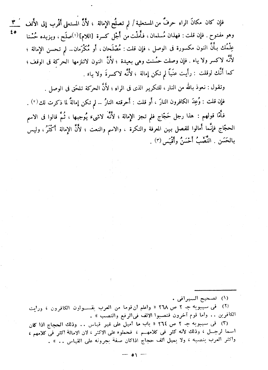 فَإِن كَانَ مَكَان الرَّاء حرف من المستعلية / لم تصلح الإمالة؛ لِأَن المستعلى أقرب إِلَى الْألف وَهُوَ مَفْتُوح فَإِن قلت: فهذان مسلمان، فَأَمْلَتْ من أجل كسرة اللَّام صلح، ويزيده حسنا علمك بِأَن النُّون مَكْسُورَة فى الْوَصْل، فَإِن قلت: مصلحان، أَو مكرمان - لم تحسن الإمالة؛ لِأَنَّهُ لَا كسر وَلَا يَاء فَإِن وصلت حسنت وهى بعيدَة؛ لِأَن النُّون لَا تلزمها الْحَرَكَة فى الْوَقْف؛ كَمَا أَنَّك لَو قلت: رَأَيْت عنبا لم تكن إمالة؛ لِأَنَّهُ لَا كسرة وَلَا يَاء وَتقول: نَعُوذ بِاللَّه من النَّار، للتكرير الذى فى الرَّاء؛ لِأَن الْحَرَكَة تلْحق فى الْوَصْل فَإِن قلت: وعد الْكَافِرُونَ النَّار، إوقلت: أحرقته النَّار - لم تكن إمالة لما ذكرت لَك فَأَما قَوْلهم: هَذَا رجل حجاج فَلم تجز الإمالة؛ لِأَنَّهُ لَا شئ يُوجِبهَا، ثمَّ قَالُوا فى الِاسْم الْحجَّاج فَإِنَّمَا أمالوا للفصل بَين الْمعرفَة والنكرة، وَالِاسْم والنعت؛ لِأَن الإمالة أَكثر، وَلَيْسَ بالْحسنِ النصب أحسن وأقيس