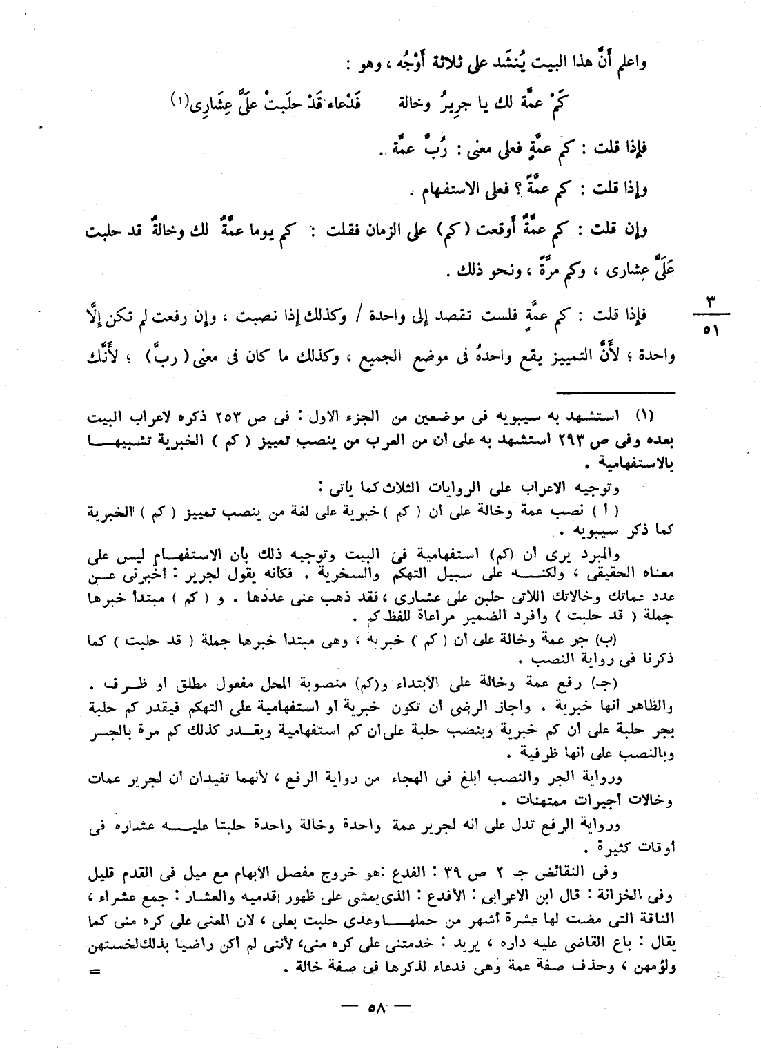 فَإِذا قلت: كم عمَّة فعلى معنى: رب عمَّة وَإِذا قلت: كم عمَّة؟ فعلى الِاسْتِفْهَام وَإِن قلت: كم عمَّة أوقعت (كم) على الزَّمَان فَقلت: كم يَوْمًا عمَّة لَك وخاله قد حلبت على عشارى، وَكم مرّة، وَنَحْو ذَلِك فَإِذا قلت: كم عمَّة فلست تقصد إِلَى وَاحِدَة / وَكَذَلِكَ إِذا نصبت، وَإِن رفعت لم تكن إِلَّا وَاحِدَة؛ لِأَن التَّمْيِيز يَقع وَاحِدَة فى مَوضِع الْجَمِيع، وَكَذَلِكَ مَا كَانَ فى معنى (رب) ؛ لِأَنَّك