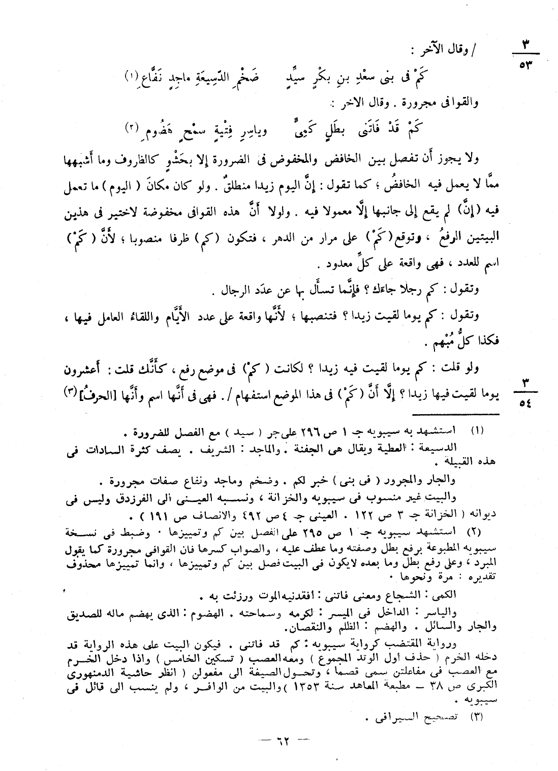 وَلَا يجوز أَن تفصل بَين الْخَافِض والمخفوض فى الضَّرُورَة إِلَّا بحشو كالظروف وَمَا أشبههَا مِمَّا لَا يعْمل فِيهِ الْخَافِض؛ كَمَا تَقول: إِن الْيَوْم زيدا منطلق وَلَو كَانَ مَكَان (الْيَوْم) مَا تعْمل فِيهِ (إِن) لم يَقع إِلَى جَانبهَا إِلَّا مَعْمُولا فِيهِ وَلَوْلَا أَن هَذِه القوافى مخفوض لاختير فى هذَيْن الْبَيْتَيْنِ الرّفْع، وتوقع (كم) على مرار من الدَّهْر، فَتكون (كم) ظرفا مَنْصُوبًا؛ لِأَن (كم) اسْم الْعدَد، فهى واقعه على كل مَعْدُود وَتقول: كم رجلا جَاءَك؟ فَإِنَّمَا تسْأَل بهَا عَن عدد الرِّجَال وَتقول: كم يَوْمًا لقِيت زيدا؟ فتنصبها؛ لِأَنَّهَا وَاقعَة على عدد الْأَيَّام واللقاء الْعَامِل فِيهَا، فَكَذَا كل مُبْهَم وَلَو قلت: كم يَوْمًا لقِيت فِيهِ زيدا؟ لكَانَتْ (كم) فى مَوضِع رفع، كَأَنَّك قلت: أعشرون يَوْمًا لقِيت فِيهَا زيدا؟ إِلَّا أَن (كم) فى هَذَا الْموضع اسْتِفْهَام / فهى فى أَنَّهَا اسْم وَأَنَّهَا الْحَرْف