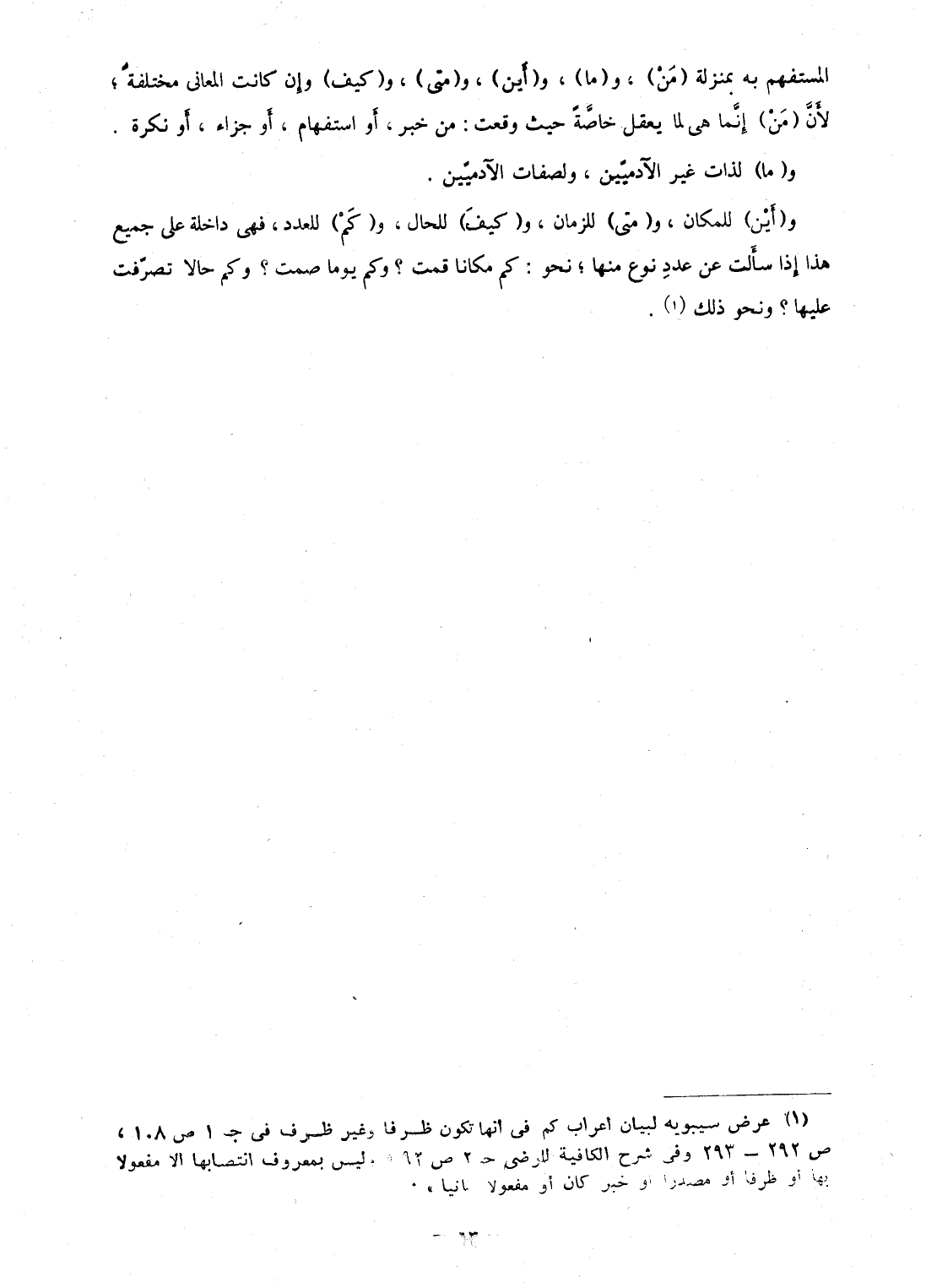 المستفهم بِهِ بِمَنْزِلَة (من) ، و (مَا) ، و (أَيْن) ، و (مَتى) ، و (كَيفَ) وَإِن كَانَت الْمعَانى مُخْتَلفَة؛ لِأَن (من) إِنَّمَا هى لما يعقل خَاصَّة حَيْثُ وَقعت: من الْخَبَر، أَو اسْتِفْهَام، أَو جَزَاء، أَو نكرَة و (مَا) لذات غير الْآدَمِيّين، ولصفات الْآدَمِيّين و (أَيْن) للمكان، و (مَتى) للزمان، و (كَيفَ) للْحَال، و (كم) للعدد، فهى دَاخِلَة على جَمِيع هَذَا إِذا سَأَلت عَن عدد نوع مِنْهَا؛ نَحْو: كم مَكَانا قُمْت؟ وَكم يَوْمًا صمت؟ وَكم حَالا تصرفت عَلَيْهَا؟ وَنَحْو ذَلِك