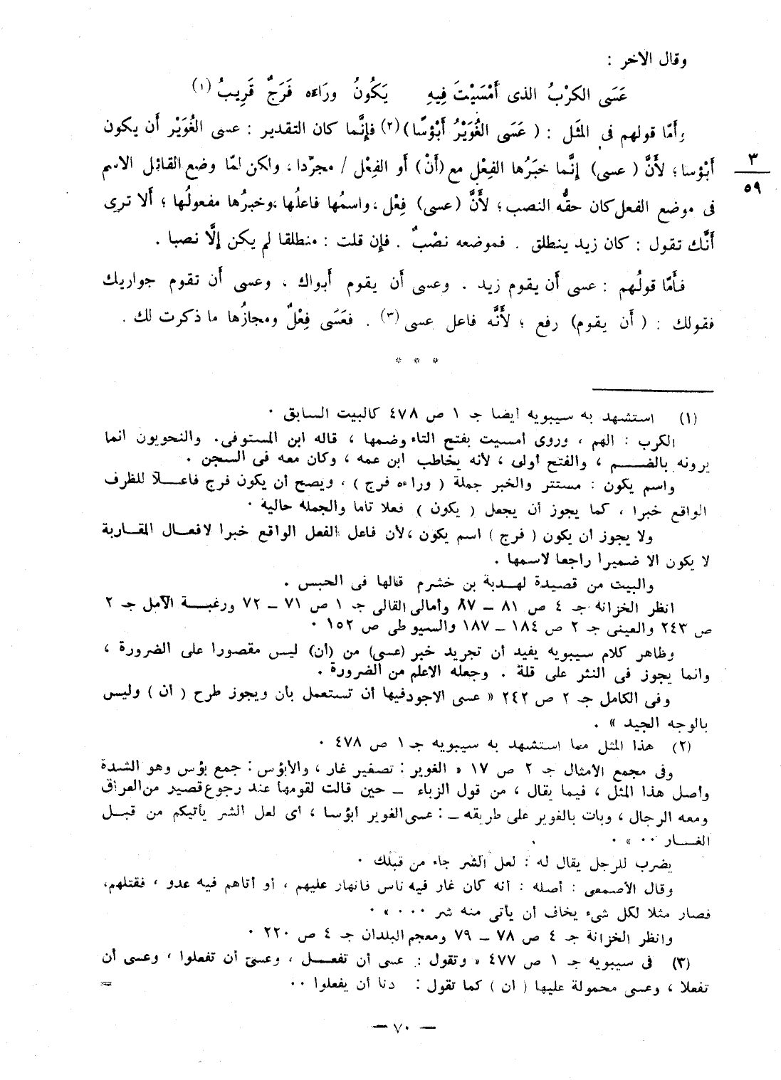 وَأما قَوْلهم فى الْمثل: (عَسى الغوير أبؤسا) فَإِنَّمَا كَانَ التَّقْدِير: عَسى الغوير أَن يكون أبوسا؛ لِأَن (عَسى) إِنَّمَا خَبَرهَا الْفِعْل مَعَ (أَن) أَو الْفِعْل / مُجَردا، وَلَكِن لما وضع الْقَائِل الِاسْم فى مَوضِع الْفِعْل كَانَ حَقه النصب؛ لِأَن (عَسى) فعل، وَاسْمهَا فاعلها، وخبرها مفعولها؛ أَلا ترى أَنَّك تَقول: كَانَ زيد ينْطَلق فموضعه نصب فَإِن قلت: مُنْطَلقًا لم يكن إِلَّا نصبا فَأَما قَوْلهم: عَسى أَن يقوم زيد، وَعَسَى أَن يقوم أَبوك، وَعَسَى أَن تقوم جواريك فقولك: (أَن يقوم) رفع؛ لِأَنَّهُ فَاعل عَسى فَعَسَى فعل ومجازها مَا ذكرت لَك