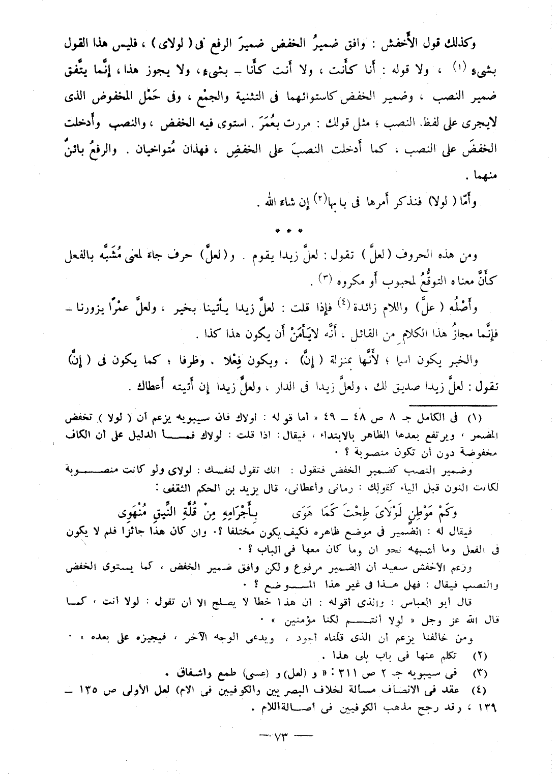وَكَذَلِكَ قَول الْأَخْفَش: وَافق ضمير الْخَفْض ضمير الرّفْع فى (لولاى) ، فَلَيْسَ هَذَا القَوْل بشئ، وَلَا قَول: أَنا كَأَنْت، وَلَا أَنْت كأنا - بشئ، وَلَا يجوز هَذَا، إِنَّمَا يتَّفق ضمير النصب، وَضمير الْخَفْض كاستوائهما فى التَّثْنِيَة وَالْجمع، وفى حمل المخفوض الذى لَا يجرى على لفظ النصب؛ مثل قَوْلك: مَرَرْت بعمر اسْتَوَى فِيهِ الْخَفْض، وَالنّصب وأدخلت الْخَفْض على النصب، كَمَا أدخلت النصب على الْخَفْض، فهذان متواخيان وَالرَّفْع بَائِن مِنْهُمَا وَأما (لَوْلَا) فَنَذْكُر أمرهَا فى بَابهَا إِن شَاءَ الله وَمن هَذِه الْحُرُوف (لَعَلَّ) تَقول: لَعَلَّ زيدا يقوم و (لَعَلَّ) حرف جَاءَ لِمَعْنى مشبه بِالْفِعْلِ كَأَن مَعْنَاهُ التوقيع لمحبوب أَو مَكْرُوه وَأَصله (عل) وَاللَّام زَائِدَة فَإِذا قلت: لَعَلَّ زيدا يأتينا بِخَير، وَلَعَلَّ عمرا يزورنا - فَإِنَّمَا مجَاز هَذَا الْكَلَام من الْقَائِل، أَنه لَا يَأْمَن أَن يكون هَذَا كَذَا وَالْخَبَر يكون اسْما؛ لِأَنَّهَا بِمَنْزِلَة (إِن) ، وَيكون فعلا، وظرفا؛ كَمَا يكون فى (إِن) تَقول: لَعَلَّ زيدا صديق لَك، وَلَعَلَّ زيدا فى الدَّار، وَلَعَلَّ زيدا إِن أَتَيْته أَعْطَاك