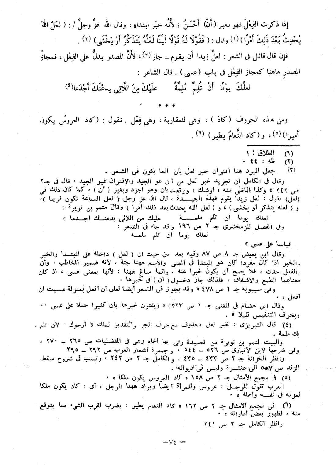 إِذا ذكرت الْفِعْل فَهُوَ بِغَيْر (أَن) أحسن؛ لِأَنَّهُ خبر ابْتِدَاء، وَقَالَ الله عز وَجل /: (لعَلّ اللهَ يُحْدِثُ بَعْدَ ذَلِكَ أَمْراً} وَقَالَ: {فَقُوْلاَ لَهُ قَوْلاً لَيَّنًا لَعَلَّهُ يَتَذَكَّرُ أَوْ يَخشَى} فَإِن قَالَ الْقَائِل فى الشّعْر: لَعَلَّ زيدا أَن يقوم - جَازَ؛ لِأَن الْمصدر يدل على الْفِعْل، فمجاز الْمصدر هَاهُنَا كمجاز الْفِعْل فى بَاب (عَسى) قَالَ الشَّاعِر: