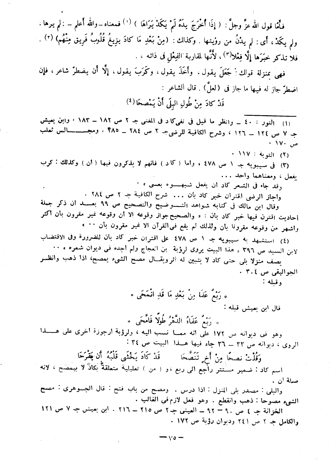 فَأَما قَول الله عز وَجل: {إِذا أخرج يَده لم يكد يَرَاهَا} فَمَعْنَاه - وَالله أعلم -: لم يرهَا، وَلم يكد، أى: لم يدن من رؤيتها وَكَذَلِكَ: {من بعد مَا كَاد يزِيغ قُلُوب فريق مِنْهُم} فَلَا تذكر خَبَرهَا إِلَّا فعلا، لِأَنَّهَا لمقاربة الْفِعْل فى ذَاته فهى بِمَنْزِلَة قَوْلك: جعل يَقُول، وَأخذ يَقُول، وكرب يَقُول، إِلَّا أَن يضْطَر شَاعِر، فَإِن اضْطر جَازَ لَهُ فِيهَا مَا جَازَ فى (لَعَلَّ) قَالَ الشَّاعِر: