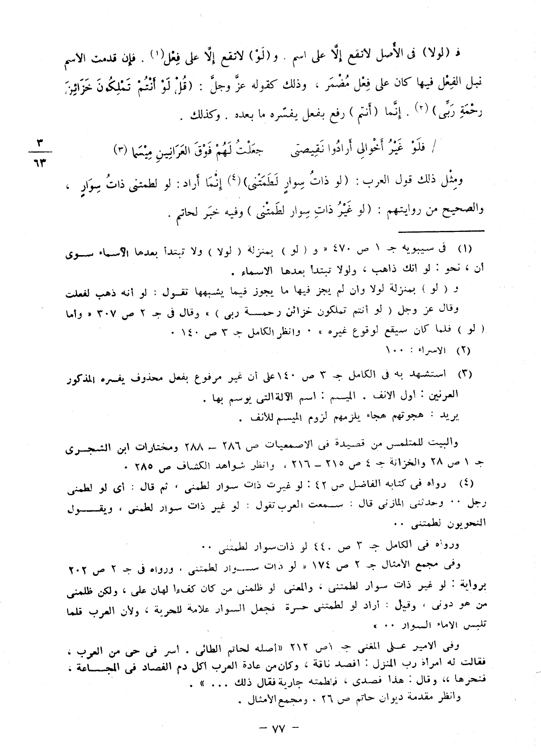 وَمثل ذَلِك قَول الْعَرَب: (لَو ذَات سوار لطمتنى) إِنَّمَا أَرَادَ: لَو لطمتنى ذَات سوار، وَالصَّحِيح من روايتهم: (لَو غير ذَات سوار لطمتنى) وَفِيه خبر لحاتم