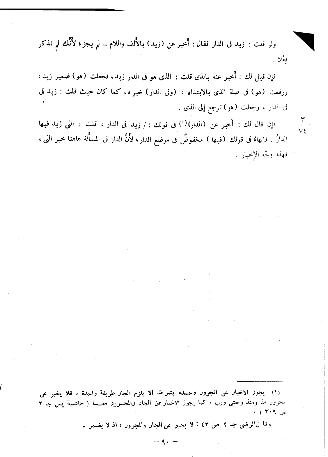 وَلَو قلت: زيد فى الدَّار فَقَالَ: أخبر عَن (زيد) بِالْألف وَاللَّام - لم يجز؛ لِأَنَّك لم تذكر فعلا فَإِن قيل لَك: أخبر عَنهُ بالذى قلت: الذى هُوَ فى الدَّار زيد، فَجعلت (هُوَ) ضمير زيد، وَرفعت (هُوَ) فى صلَة الذى بِالِابْتِدَاءِ، (وفى الدَّار) خَبره، كَمَا كَانَ حَيْثُ قلت: زيد فى الدَّار، وَجعلت (هُوَ) ترجع إِلَى الذى فَإِن قَالَ لَك: أخبر عَن (الدَّار) فى قَوْلك: / زيد فى الدَّار، قلت: الَّتِى زيد فِيهَا الدَّار فالهاء فى قَوْلك (فِيهَا) مخفوض فى مَوضِع الدَّار؛ لِأَن الدَّار فى المسالة هَاهُنَا خبر الَّتِى، فَهَذَا وَجه الْإِخْبَار