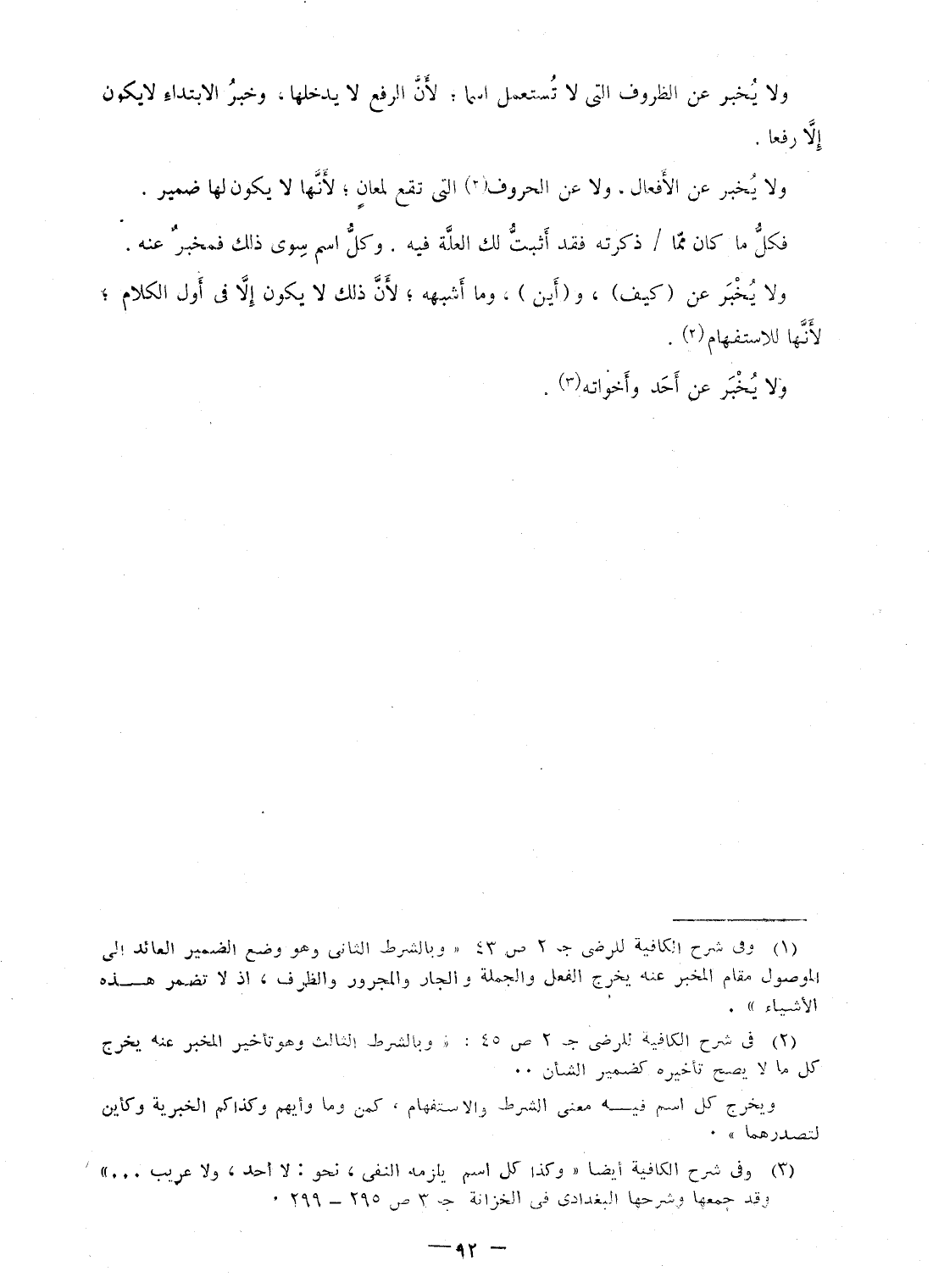 وَلَا يخبر عَن الظروف الَّتِى لَا تسْتَعْمل اسْما؛ لِأَن الرّفْع لَا يدخلهَا، وَخبر الِابْتِدَاء لَا يكون إِلَّا رفعا وَلَا يخبر عَن الْأَفْعَال، وَلَا عَن الْحُرُوف الَّتِى تقع لمعان؛ لِأَنَّهَا لَا يكون لَهَا ضمير فَكل مَا كَانَ مِمَّا / ذكرته فقد أثبت لَك الْعلَّة فِيهِ وكل اسْم ذَلِك فمخبر عَنهُ وَلَا يخبر عَن (كَيفَ) ، و (أَيْن) ، وَمَا أشبهه؛ لِأَن ذَلِك لَا يكون إِلَّا فى أول الْكَلَام؛ لِأَنَّهَا للاستفهام وَلَا يخبر عَن أحد وأخواته