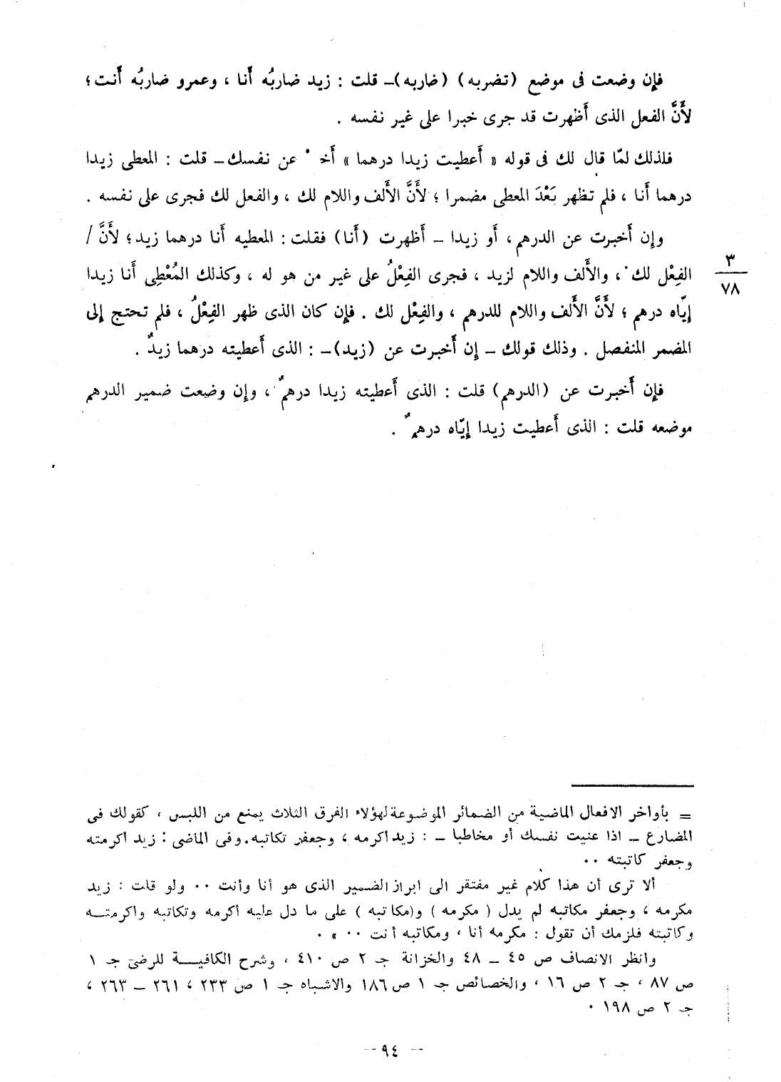 فَإِن وضعت فى مَوضِع (تضربه) (ضاربه) - قلت: زيد ضاربه أَنا، عَمْرو ضاربه أَنْت؛ لِأَن الْفِعْل الذى أظهرت قد جرى خَبرا على نَفسه فَلذَلِك لما قَالَ لَك فى قَوْله " أَعْطَيْت زيدا درهما " أخرر عَن نَفسك - قلت: الْمُعْطى زيدا درهما أَنا، فَلم تظهر بعد الْمُعْطى مضمرا؛ لِأَن الْألف وَاللَّام لَك، وَالْفِعْل لَك فَجرى على نَفسه وَإِن أخْبرت عَن الدِّرْهَم أَو زيدا أظهرت أَنا فَقلت المعطيه أَنا درهما زيد لِأَن الْفِعْل لَك وَالْألف وَاللَّام لزيد فَجرى الْفِعْل على غير من هُوَ لَهُ، وَكَذَلِكَ الْمُعْطى أَنا زيدا إِيَّاه دِرْهَم؛ لِأَن الْألف وللام للدرهم، وَالْفِعْل لَك فَإِن كَانَ الذى ظهر الْفِعْل، فَلم تحتج إِلَى الْمُضمر الْمُنْفَصِل وَذَلِكَ قَوْلك - إِن أخْبرك عَن (زيد) -: الذى أَعْطيته درهما زيد فَإِن أخْبرت عَن (الدِّرْهَم) قلت: الذى أَعْطيته زيدا دِرْهَم، وَإِن وضعت الدِّرْهَم مَوْضِعه قلت: الذى أَعْطَيْت زيدا إِيَّاه دِرْهَم