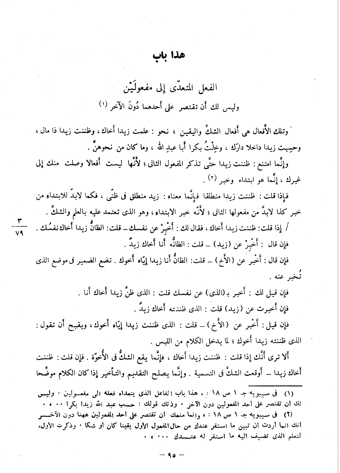 وَتلك الْأَفْعَال هى أَفعَال الشَّك وَالْيَقِين؛ نَحْو: علمت زيدا أَخَاك، وظننت زيدا ذَا مَال، وحسبت زيدا دَاخِلا دَارك، وخلت بكرا أَبَا عبد الله، وَمَا كَانَ من نحوهن وَإِنَّمَا امْتنع: ظَنَنْت زيدا حَتَّى تذكر الْمَفْعُول الثانى؛ لِأَنَّهَا لَيست أفعلا وصلت مِنْك إِلَى غَيْرك، إِنَّمَا هُوَ ابْتِدَاء وَخبر فَإِذا قلت: ظَنَنْت زيدا مُنْطَلقًا فَإِنَّمَا مَعْنَاهُ: زيد منطلق فى ظنى، فَكَمَا لَا بُد للابتداء من خبر كَذَا لابد من مفعولها الثانى؛ لِأَنَّهُ خبر الِابْتِدَاء، وَهُوَ الذى تعتمد عَلَيْهِ بِالْعلمِ وَالشَّكّ / إِذا قلت: ظَنَنْت زيدا أَخَاك، فَقَالَ لَك: أخبر عَن نَفسك - قلت: الظَّان زيدا أَخَاك نَفسك فَإِن قَالَ: أخبر عَن (زيد) - قلت: الظانه أَنا أَخَاك زيد فَإِن قَالَ: أخبر عَن (زيد) - قلت: الظانه أَنا أَخَاك زيد - فَإِن قيل: أخبر عَن (الْأَخ) - قلت: الذى ظَنَنْت زيدا إِيَّاه أَخُوك، ويقبح أَن تَقول: الذى ظننته زيدا أَخُوك؛ لما يدْخل الْكَلَام من اللّبْس أَلا ترى أَنَّك إِذا قلت: ظَنَنْت زيدا أَخَاك، فَإِنَّمَا يَقع الشَّك فى الْأُخوة فَإِن قلت: ظَنَنْت أَخَاك زيدا - أوقعت الشَّك فى التَّسْمِيَة وَإِنَّمَا يصلح التَّقْدِيم وَالتَّأْخِير إِذا كَانَ الْكَلَام موضحا
