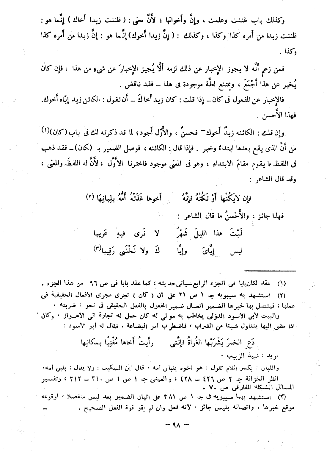 وَكَذَلِكَ بَاب ظَنَنْت وَعلمت، وَإِن وَأَخَوَاتهَا؛ لِأَن معنى: (ظَنَنْت زيدا أَخَاك) إِنَّمَا هُوَ: ظَنَنْت زيدا من أمره كَذَا وَكَذَا، وَكَذَلِكَ: (إِن زيدا أَخُوك) إِنَّمَا هُوَ: إِن زيدا من أمره كَذَا وَكَذَا فَمن زعم أَنه لَا يجوز الْإِخْبَار عَن ذَلِك لزمَه أَلا يُجِيز الْإِخْبَار عَن شئ من هَذَا، فَإِن كَانَ يخبر عَن هَذَا أجمع، وَيمْتَنع لعِلَّة مَوْجُودَة فى هَذَا - فقد نَاقض فالإخبار عَن الْمَفْعُول فى كَانَ - إِذا قلت: كَانَ زيد أَخَاك - أَن تَقول: الْكَائِن زيد إِيَّاه أَخُوك فَهَذَا الْأَحْسَن وَإِن قلت: الكائنه زيد أَخُوك - فَحسن، وَالْأول أَجود؛ لما قد ذكرته لَك فى بَاب (كَانَ) من أَن الذى يَقع بعْدهَا ابْتِدَاء وَخبر فَإِذا قَالَ: الكائنة، فوصل الضَّمِير ب (لَكَانَ) - فقد ذهب فى اللَّفْظ مَا يقوم مقَام الِابْتِدَاء، وَهُوَ فى الْمَعْنى مَوْجُود فاخترنا الأول؛ لِأَن لَهُ اللَّفْظ وَالْمعْنَى، وَقَالَ الشَّاعِر: