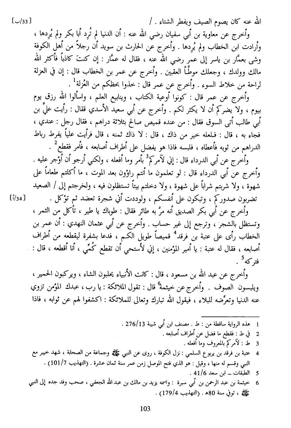 وأخرج عن معاوية بن أبي سفيان رضي الله عنه: أن الدنيا لم ترد أبا بكر ولم يردها، وأرادت ابن الخطاب ولم يردها. وأخرج عن الحارث بن سويد أن رجلا من أهل الكوفة وشى بعمّار بن ياسر إلى عمر رضي الله عنه، فقال له عمّار: إن كنت كاذبا فأكثر الله مالك وولدك، وجعلك موطّأ العقبين. وأخرج عن عمر بن الخطاب قال: إن في العزلة لراحة من خلاط السوء. وأخرج عن عمر قال: خذوا بحظكم من العزلة [1] .