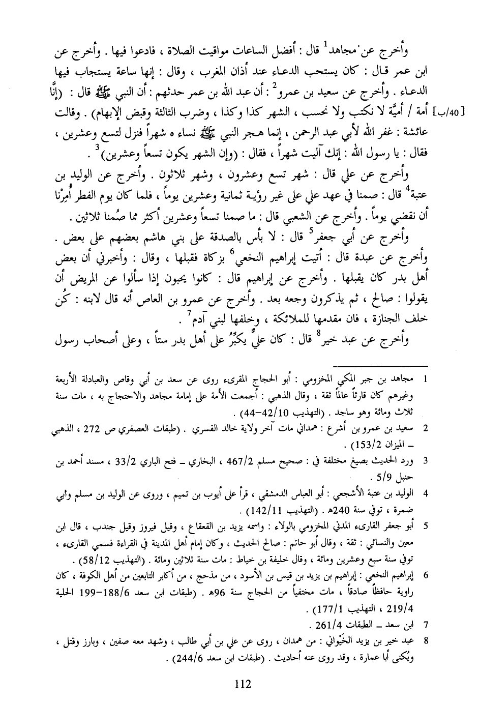 [1] مجاهد بن جبر المكي المخزومي: أبو الحجاج المقرئ روى عن سعد بن أبي وقاص والعبادلة الأربعة وغيرهم كان قارئا عالما ثقة، وقال الذهبي: أجمعت الأمة على إمامة مجاهد والاحتجاج به، مات سنة ثلاث ومائة وهو ساجد. (التهذيب 10/42- 44) .