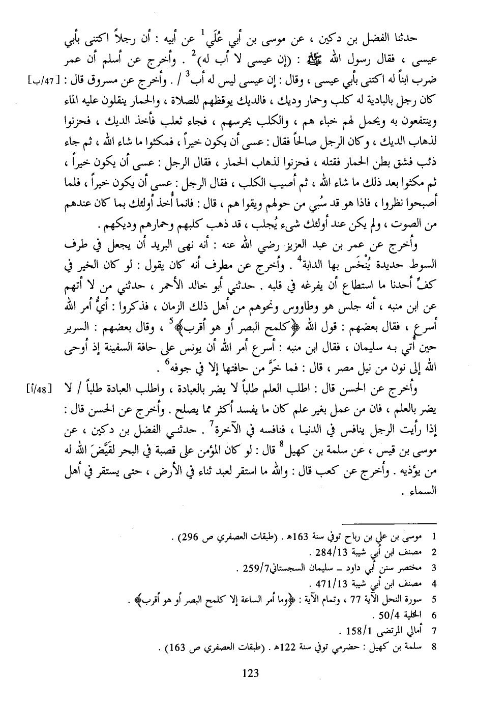 وأخرج عن عمر بن عبد العزيز رضي الله عنه: أنه نهى البريد أن يجعل في طرف السوط حديدة ينخس بها الدابة [4] . وأخرج عن مطرف أنه كان يقول: لو كان الخير في كفّ أحدنا ما استطاع أن يفرغه في قلبه. حدثني أبو خالد الأحمر، حدثني من لا أتهم عن ابن منبه، أنه جلس هو وطاووس ونحوهم من أهل ذلك الزمان، فذكروا: أيّ أمر الله أسرع، فقال بعضهم: قول الله كَلَمْحِ الْبَصَرِ أَوْ هُوَ أَقْرَبُ