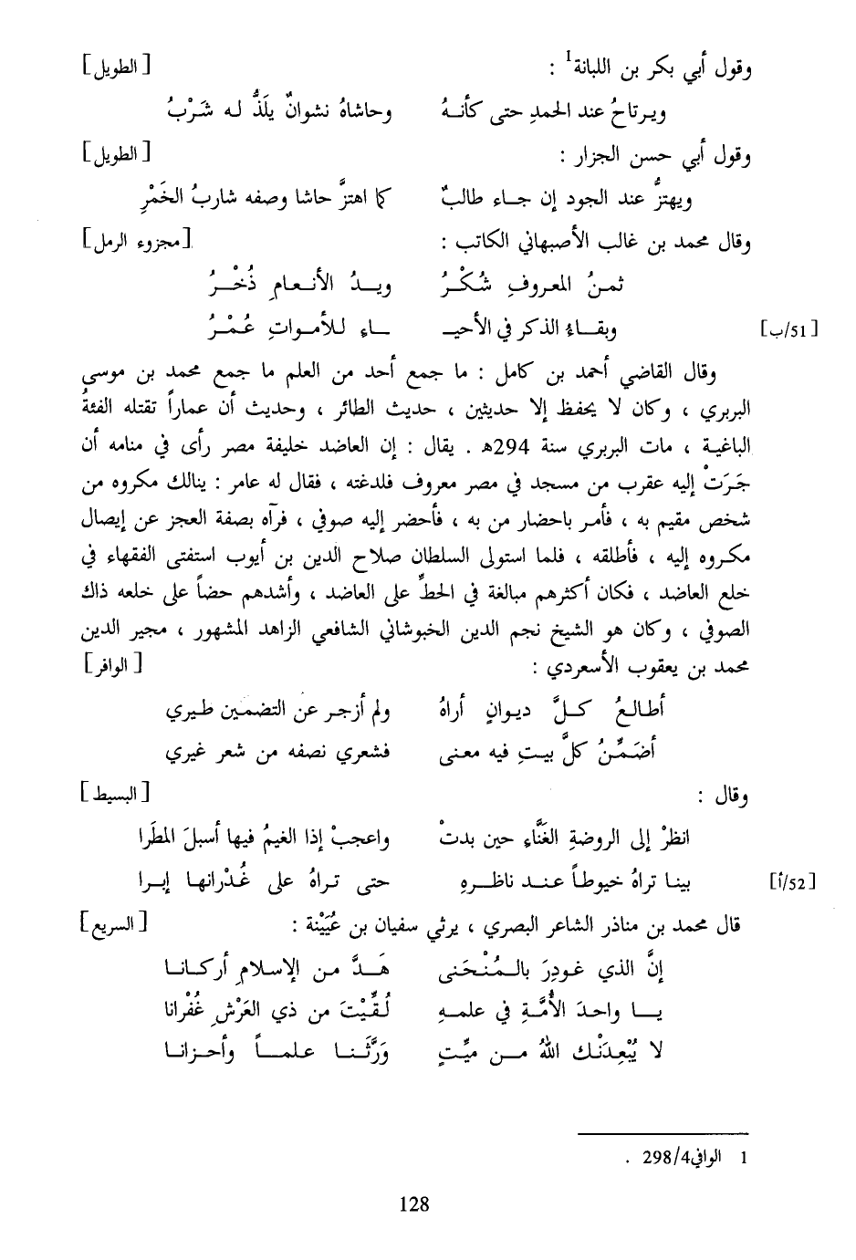 وقال القاضي أحمد بن كامل: ما جمع أحد من العلم ما جمع محمد بن موسى البربري، وكان لا يحفظ إلا حديثين، حديث الطائر، وحديث أن عمارا تقتله الفئة الباغية، مات البربري سنة 294 هـ. يقال: إن العاضد خليفة مصر رأى في منامه أن جرت إليه عقرب من مسجد في مصر معروف فلدغته، فقال له عامر: ينالك مكروه من شخص مقيم به، فأمر باحضار من به، فأحضر إليه صوفي، فرآه بصفة العجز عن إيصال مكروه إليه، فأطلقه، فلما استولى السلطان صلاح الدين بن أيوب استفتى الفقهاء في خلع العاضد، فكان أكثرهم مبالغة في الحطّ على العاضد، وأشدهم حضا على خلعه ذاك الصوفي، وكان هو الشيخ نجم الدين الخبوشاني الشافعي الزاهد المشهور، مجير الدين محمد بن يعقوب الأسعردي: [الوافر]