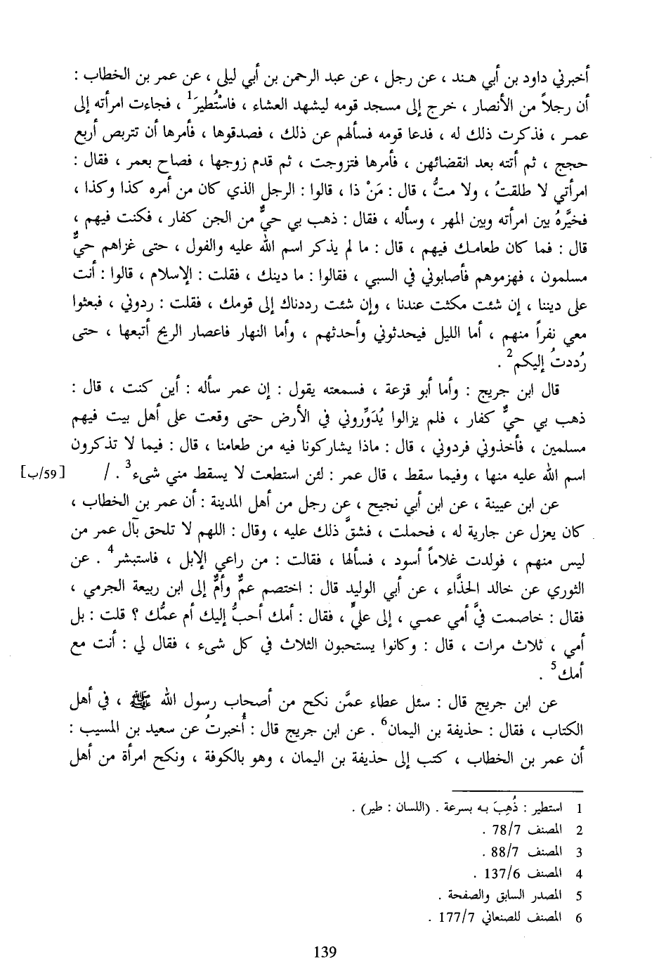 عن ابن جريج قال: سئل عطاء عمّن نكح من أصحاب رسول الله صلّى الله عليه وسلم، في أهل الكتاب، فقال: حذيفة بن اليمان [6] . عن ابن جريج قال: أخبرت عن سعيد بن المسيب: