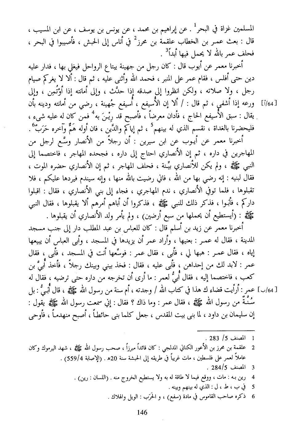 المسلمين غزاة في البحر [1] . عن إبراهيم بن محمد، عن يونس بن يوسف، عن ابن المسيب، قال: بعث عمر بن الخطاب علقمة بن محرز [2] في أناس إلى الحبش، فأصيبوا في البحر، فحلف عمر بالله لا يحمل فيها أبدا [3] .