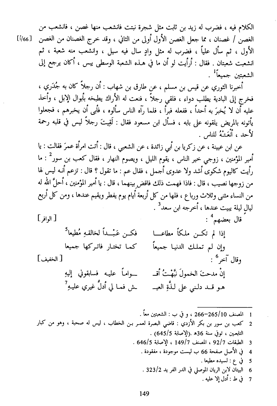 عن ابن عيينة، عن زكريا بن أبي زائدة، عن الشعبي، قال: أتت امرأة عمر فقالت: يا أمير المؤمنين، زوجي خير الناس، يقوم الليل، ويصوم النهار، فقال كعب بن سور [2] : ما رأيت كاليوم شكوى أشد ولا عدوى أجمل، فقال عم: ما تقول؟ قال: تزعم أنه ليس لها من زوجها نصيب، قال: فاذا فهمت ذلك فاقض بينهما، قال: يا أمير المؤمنين، أحلّ الله له من النساء مثنى وثلاث ورباع، فلها من كل أربعة أيام يوم يفطر ويقيم عندها، ومن كل أربع ليال ليلة يبيت عندها، أخرجه ابن سعد [3] .
