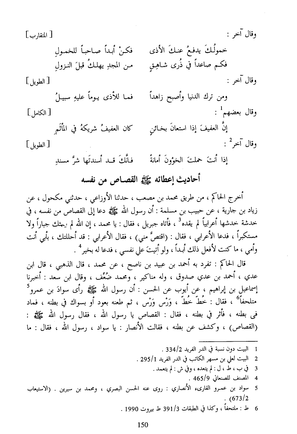 قال الحاكم: تفرد به أحمد بن عبيد بن ناصح، عن محمد، قال الذهبي، قال ابن عدي، أحمد بن عدي صدوق، وله مناكير، ومحمد ضعّف، وقال ابن سعد: أخبرنا إسماعيل بن إبراهيم، عن أيوب عن الحسن: أن رسول الله صلّى الله عليه وسلم رأى سواد بن عمرو [5] متلحفا [6] ، فقال: خطّ خطّ، ورس ورس، ثم طعنه بعود أو بسواك في بطنه، فماد فى بطنه، فأثر في بطنه، فقال: القصاص يا رسول الله، فقال رسول الله صلّى الله عليه وسلم: