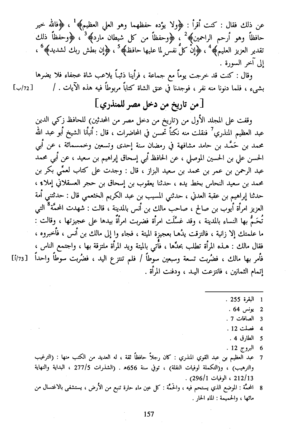 وقفت على المجلد الأول من (تاريخ من دخل مصر من المحدثين) للحافظ زكي الدين عبد العظيم المنذري [7] فنقلت منه نكتا تحسن في المحاضرات، قال: أنبأنا الشيخ أبو عبد الله محمد بن حمّد بن حامد مشافهة في رمضان سنة إحدى وتسعين وخمسمائة، عن أبي الحسن علي بن الحسين الموصلي، عن الحافظ أبي إسحاق إبراهيم بن سعيد، عن أبي محمد عبد الرحمن بن عمر بن محمد بن سعيد البزاز، قال: وجدت على كتاب لعمّي بكر بن محمد بن سعيد النحاس بخط يده، حدثنا يعقوب بن إسحاق بن حجر العسقلاني إملاء، حدثنا إبراهيم بن عقبة العدني، حدثني المسيب بن عبد الكريم الخثعمي قال: حدثتني أمة العزيز امرأة أيوب بن صالح، صاحب مالك بن أنس بالمدينة، قالت: شهدت المحمّة [8] التي تحمّ بها النساء بالمدينة، وقد غسّلت امرأة فضربت امرأة بيدها على عجيزتها، وقالت: