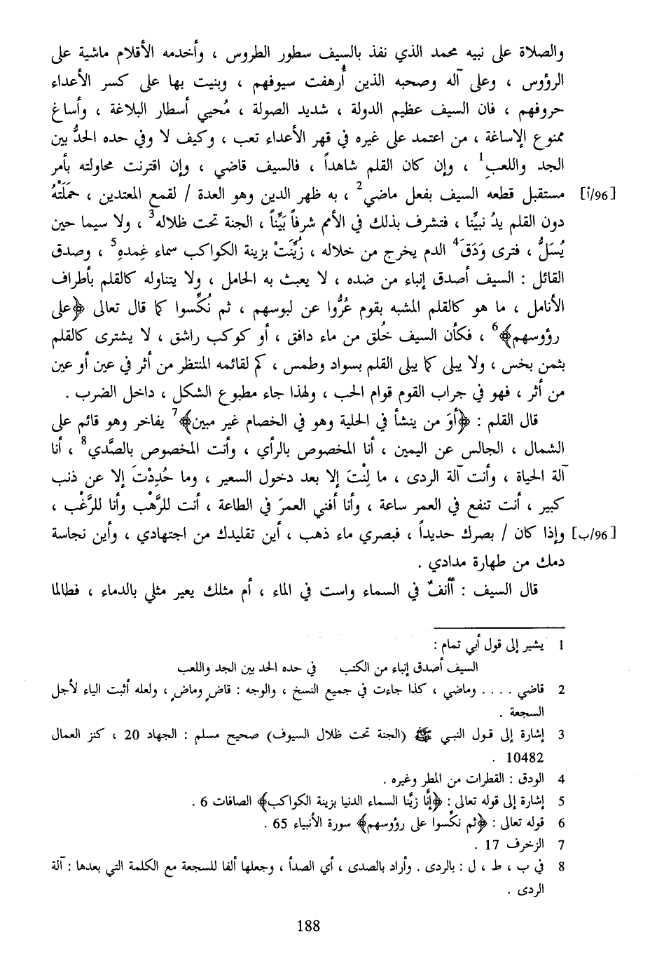 [6] ، فكأن السيف خلق من ماء دافق، أو كوكب راشق، لا يشترى كالقلم بثمن بخس، ولا يبلى كما يبلى القلم بسواد وطمس، كم لقائمه المنتظر من أثر في عين أو عين من أثر، فهو في جراب القوم قوام الحب، ولهذا جاء مطبوع الشكل، داخل الضرب.