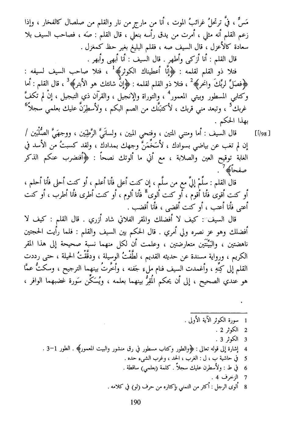 قال السيف: أما ومتني المتين، وفتحي المبين، ولسانيّ الرّطبين، ووجهيّ الصّلبين/ إن لم تغب عن بياضي بسوادك، لأسخّمنّ وجهك بمدادك، ولقد كسبت من الأسد في الغابة توقيح العين والصلابة، مع أني ما ألوتك نصحا: أَفَنَضْرِبُ عَنْكُمُ الذِّكْرَ صَفْحاً