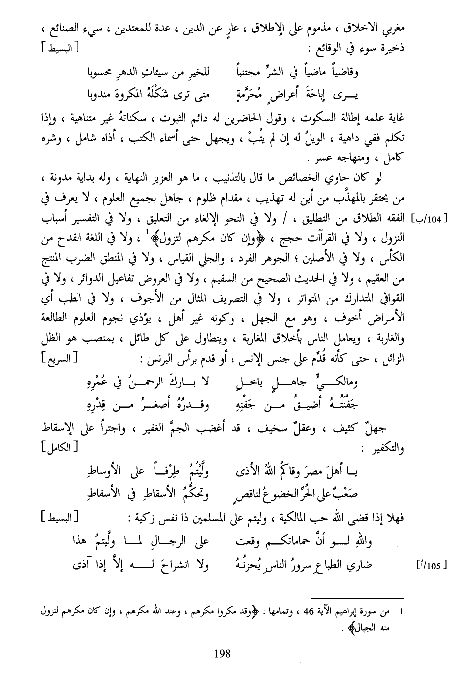 لو كان حاوي الخصائص ما قال بالتذنيب، ما هو العزيز النهاية، وله بداية مدونة، من يحتقر بالمهذّب من أين له تهذيب، مقدام ظلوم، جاهل بجميع العلوم، لا يعرف في الفقه الطلاق من التطليق،/ ولا في النحو الإلغاء من التعليق، ولا في التفسير أسباب النزول، ولا في القرآات حجج، وَإِنْ كانَ مَكْرُهُمْ لِتَزُولَ