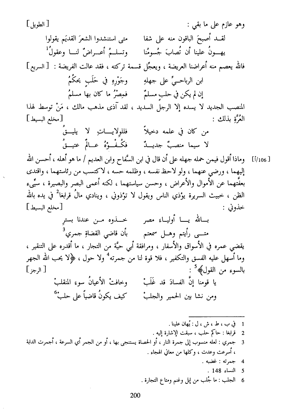 وماذا أقول فيمن حمله جهله على أن قال في ابن السّفاح وابن العديم/ ما هو أهله، أحسن الله إليهما، ورضي عنهما، ولولا حظ نفسه، وظلمه حسه، لاكتسب من رئاستهما، واقتدى بعفّتهما عن الأموال والأعراض، وحسن سياستهما، لكنه أعمى البصر والبصيرة، سيّىء الظن، خبيث السريرة يؤذي الناس ويقول لا تؤذوني، وينادي مال قرابغا [2] في يده بالله خذوني: [مخلع البسيط]