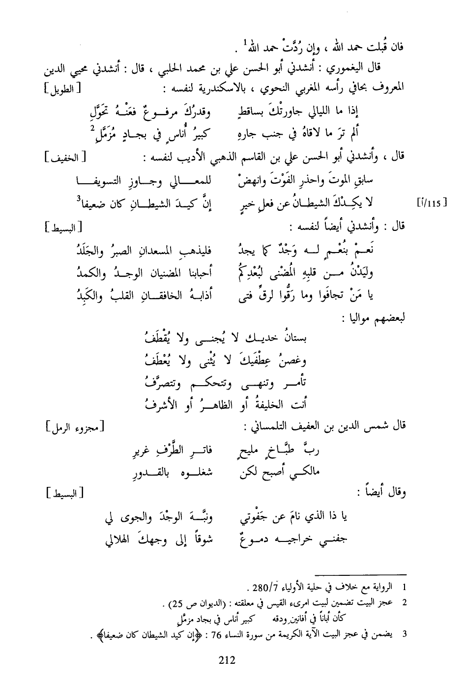 [3] يضمن في عجز البيت الآية الكريمة من سورة النساء 76: إِنَّ كَيْدَ الشَّيْطانِ كانَ ضَعِيفاً.