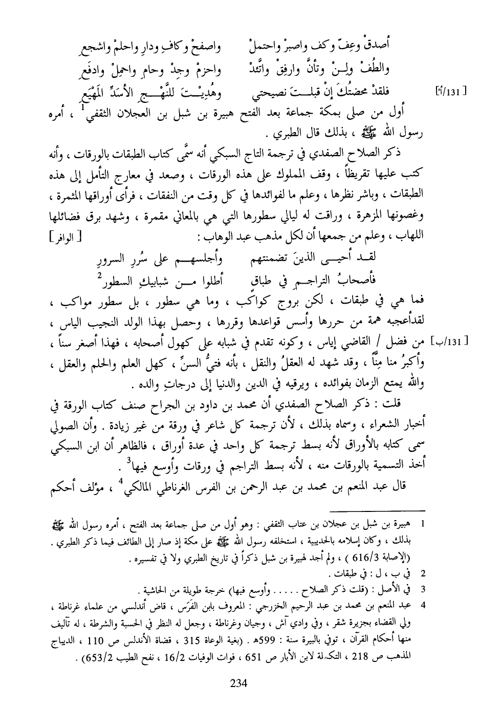 قلت: ذكر الصلاح الصفدي أن محمد بن داود بن الجراح صنف كتاب الورقة في أخبار الشعراء، وسماه بذلك، لأن ترجمة كل شاعر في ورقة من غير زيادة. وأن الصولي سمى كتابه بالأوراق لأنه بسط ترجمة كل واحد في عدة أوراق، فالظاهر أن ابن السبكي أخذ التسمية بالورقات منه، لأنه بسط التراجم في ورقات وأوسع فيها [3] .
