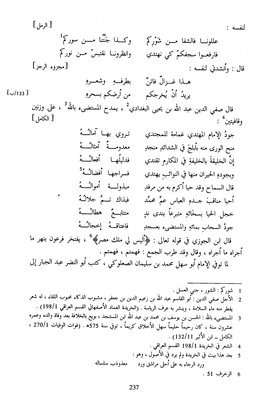 قال صفي الدين عبد الله بن يحيى البغدادي [2] ، يمدح المستضىء بالله [3] ، على وزنين وقافيتين [4] : [الكامل]
