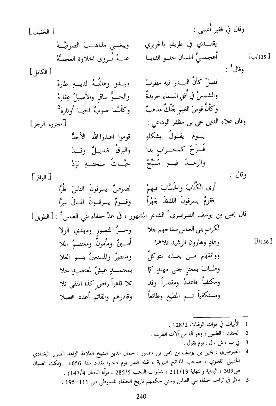 [4] الصرصري: يحيى بن يوسف بن يحيى بن منصور: جمال الدين الشيخ العلامة الزاهد الضرير البغدادي الحنبلي اللغوي، صاحب المدائح النبوية، قتله التتار يوم دخلوا بغداد سنة 656 هـ. (نكت الهميان ص 309، البداية والنهاية 13/211، شذرات الذهب 5/285، مرآة الجنان 4/147) .