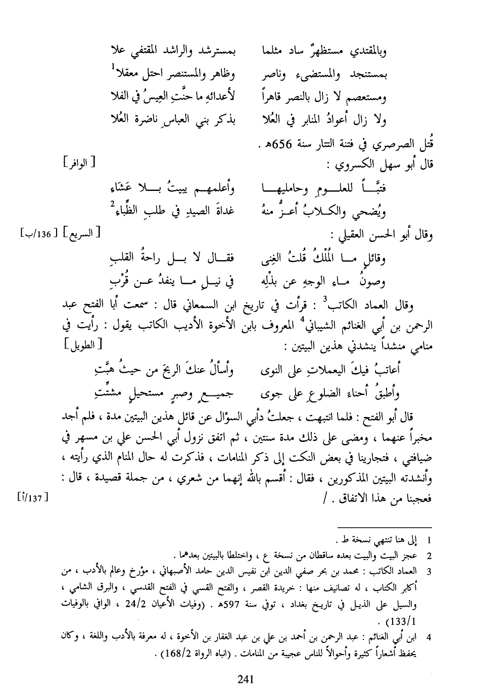 [4] ابن أبي الغنائم: عبد الرحمن بن أحمد بن علي بن عبد الغفار بن الأخوة، له معرفة بالأدب واللغة، وكان يحفظ أشعارا كثيرة وأحوالا للناس عجيبة من المنامات. (انباه الرواة 2/168) .