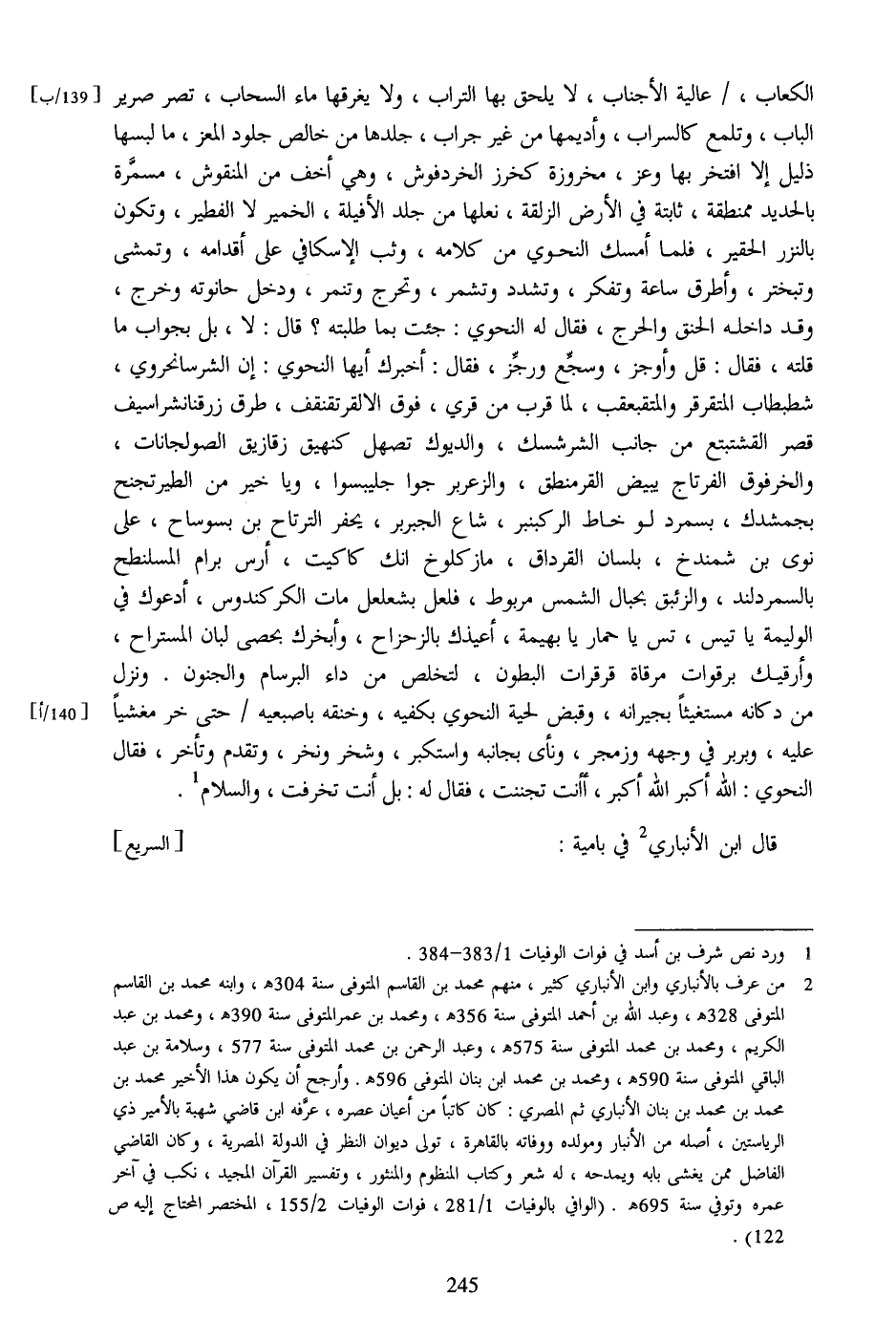 الكعاب،/ عالية الأجناب، لا يلحق بها التراب، ولا يغرقها ماء السحاب، تصر صرير الباب، وتلمح كالسراب، وأديمها من غير جراب، جلدها من خالص جلود المعز، ما لبسها ذليل إلا افتخر بها وعز، مخروزة كخرز الخردفوش، وهي أخف من المنقوش، مسمّرة بالحديد ممنطقة، ثابتة في الأرض الزلقة، نعلها من جلد الأفيلة، الخمير لا الفطير، وتكون بالنزر الحقير، فلما أمسك النحوي من كلامه، وثب الإسكافي على أقدامه، وتمشى وتبختر، وأطرق ساعة وتفكر، وتشدد وتشمر، وتحرج وتنمر، ودخل حانوته وخرج، وقد داخله الحنق والحرج، فقال له النحوي: جئت بما طلبته؟ قال: لا، بل بجواب ما قلته، فقال: قل وأوجز، وسجّع ورجّز، فقال: أخبرك أيها النحوي: إن الشرسانحروي، شطبطاب المتقرقر والمتقبعقب، لما قرب من قري، فوق الالقر تقنقف، طرق زرقنانشراسيف قصر القشتبتع من جانب الشرشسك، والديوك تصهل كنهيق زقازيق الصولجانات، والخرفوق الفرتاج يبيض القرمنطق، والزعربر جوا جليبسوا، ويا خير من الطير تجنح بجمشدك، بسمرد لو خاط الركبنبر، شاع الجبربر، يحفر الترتاح بن بسوساح، على نوى بن شمندخ، بلسان القرداق، ماز كلوخ انك كاكيت، أرس برام المسلنطح بالسمردلند، والزئبق بحبال الشمس مربوط، فلعل بشعلعل مات الكر كندوس، أدعوك في الوليمة يا تيس، تس يا حمار يا بهيمة، أعيذك بالزحزاح، وأبخرك بحصى لبان المستراح، وأرقيك برقوات مرقاة قرقرات البطون، لتخلص من داء البرسام والجنون. ونزل من دكانه مستغيثا بجيرانه، وقبض لحية النحوي بكفيه، وخنقه باصبعيه/ حتى خر مغشيا عليه، وبربر في وجهه وزمجر، ونأى بجانبه واستكبر، وشخر ونخر، وتقدم وتأخر، فقال النحوي: الله أكبر الله أكبر، أأنت تجننت، فقال له: بل أنت تخرفت، والسلام [1] .