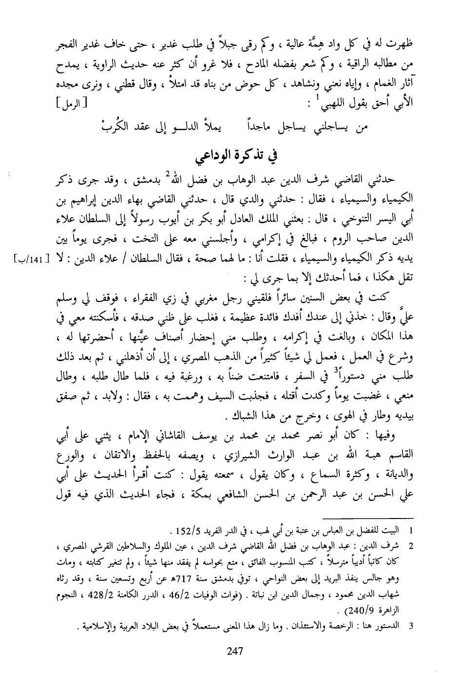 حدثني القاضي شرف الدين عبد الوهاب بن فضل الله [2] بدمشق، وقد جرى ذكر الكيمياء والسيمياء، فقال: حدثني والدي قال، حدثني القاضي بهاء الدين إبراهيم بن أبي اليسر التنوخي، قال: بعثني الملك العادل أبو بكر بن أيوب رسولا إلى السلطان علاء الدين صاحب الروم، فبالغ في إكرامي، وأجلسني معه على التخت، فجرى يوما بين يديه ذكر الكيمياء والسيمياء، فقلت أنا: ما لهما صحة، فقال السلطان/ علاء الدين: لا تقل هكذا، فما أحدثك إلا بما جرى لي: